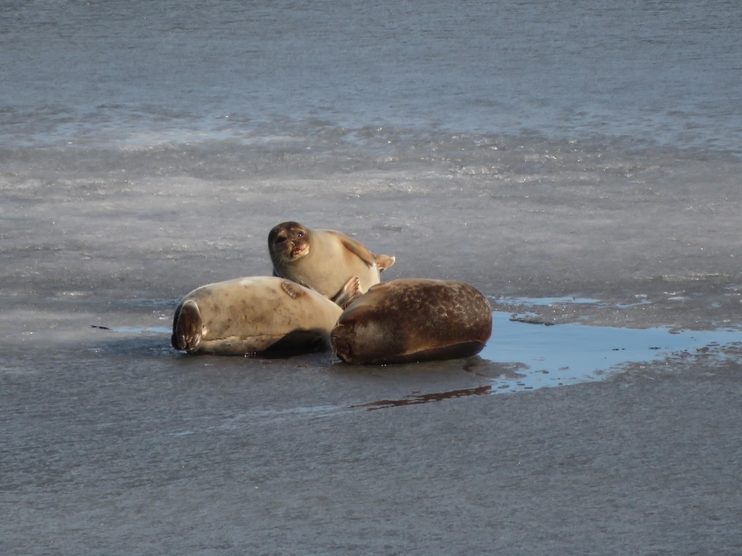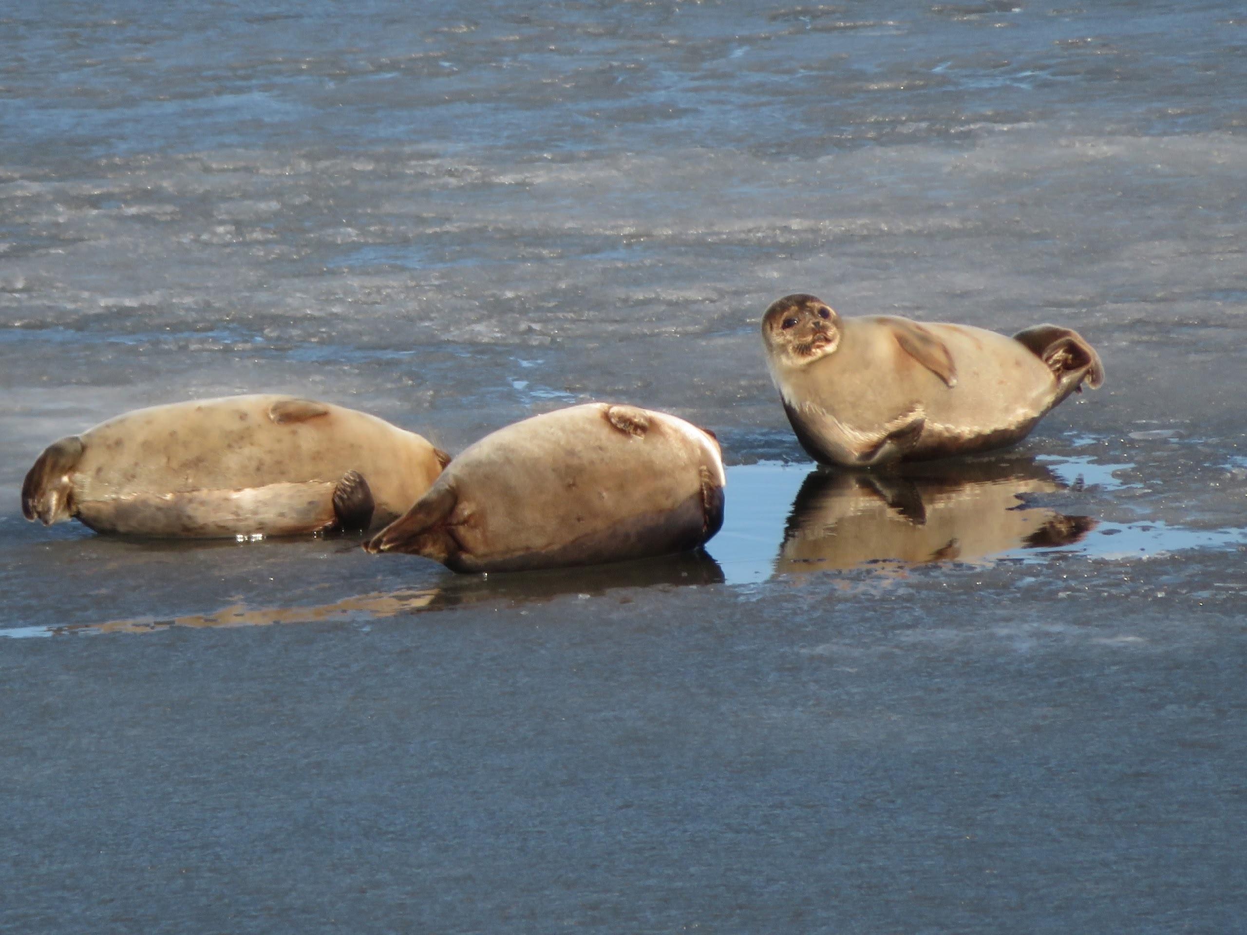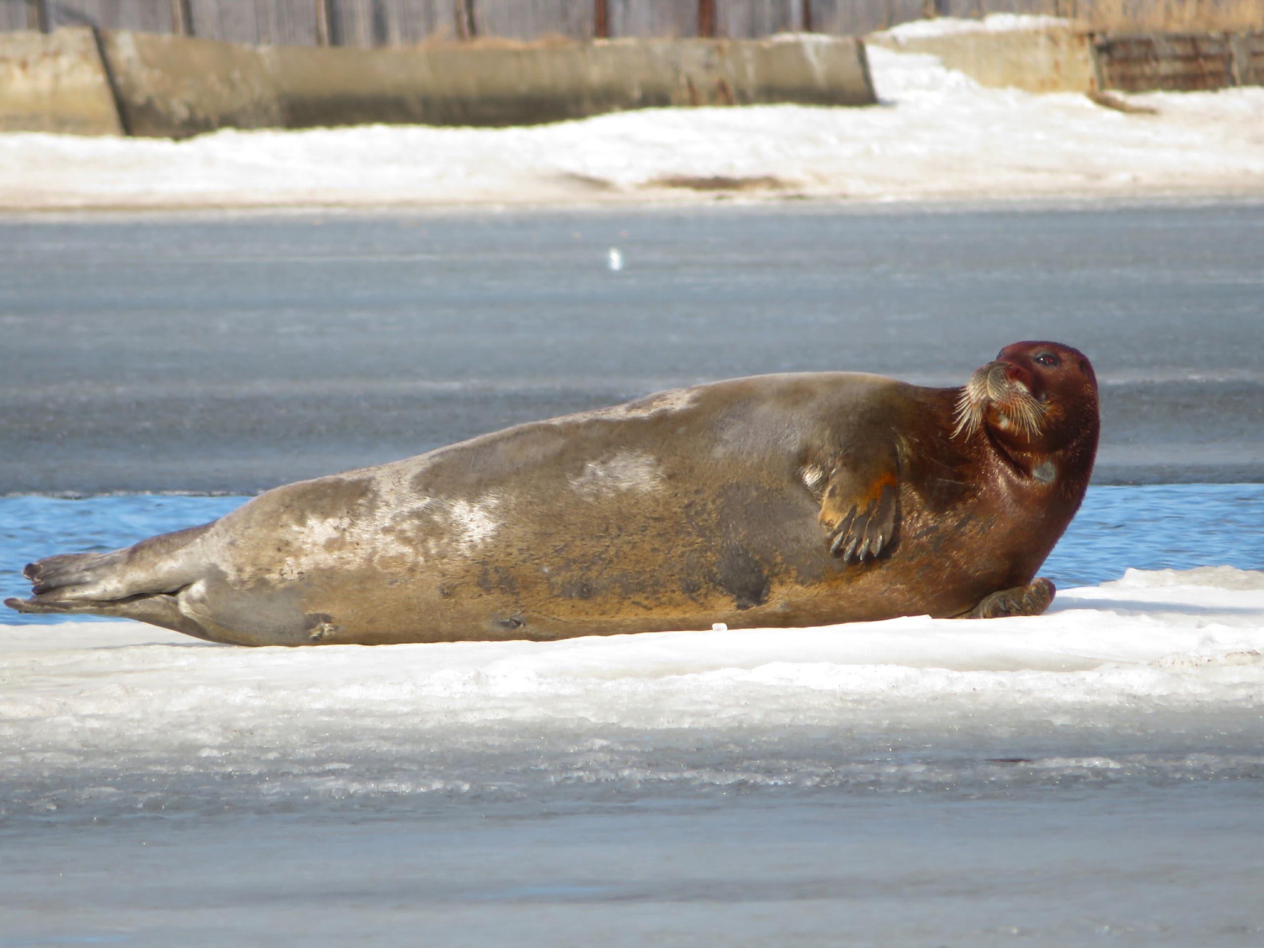 Жители Северодвинска наблюдали за нерпами и морским зайцем, которые спокойно отдыхали на берегу. Животные не проявили страха перед людьми.