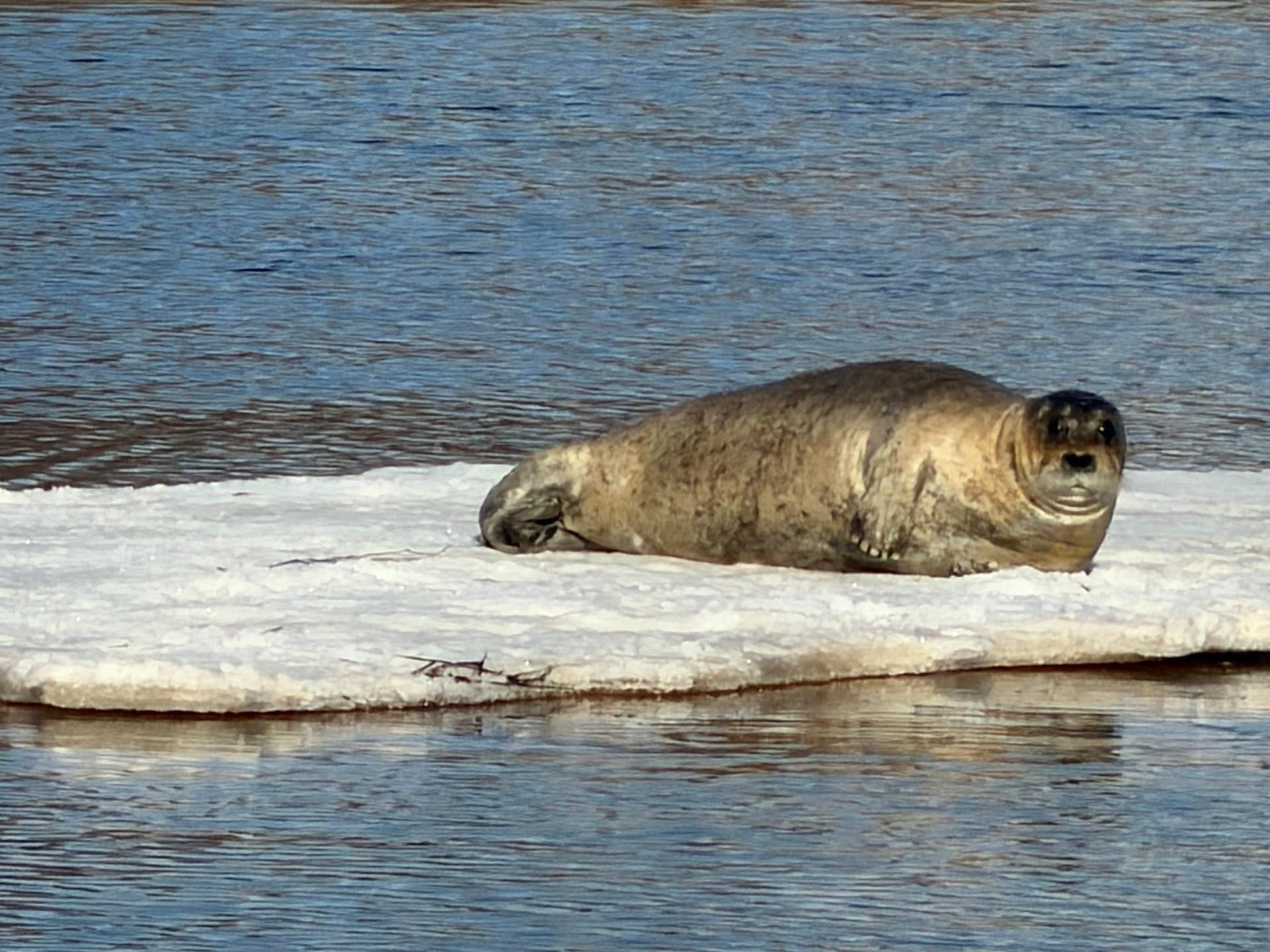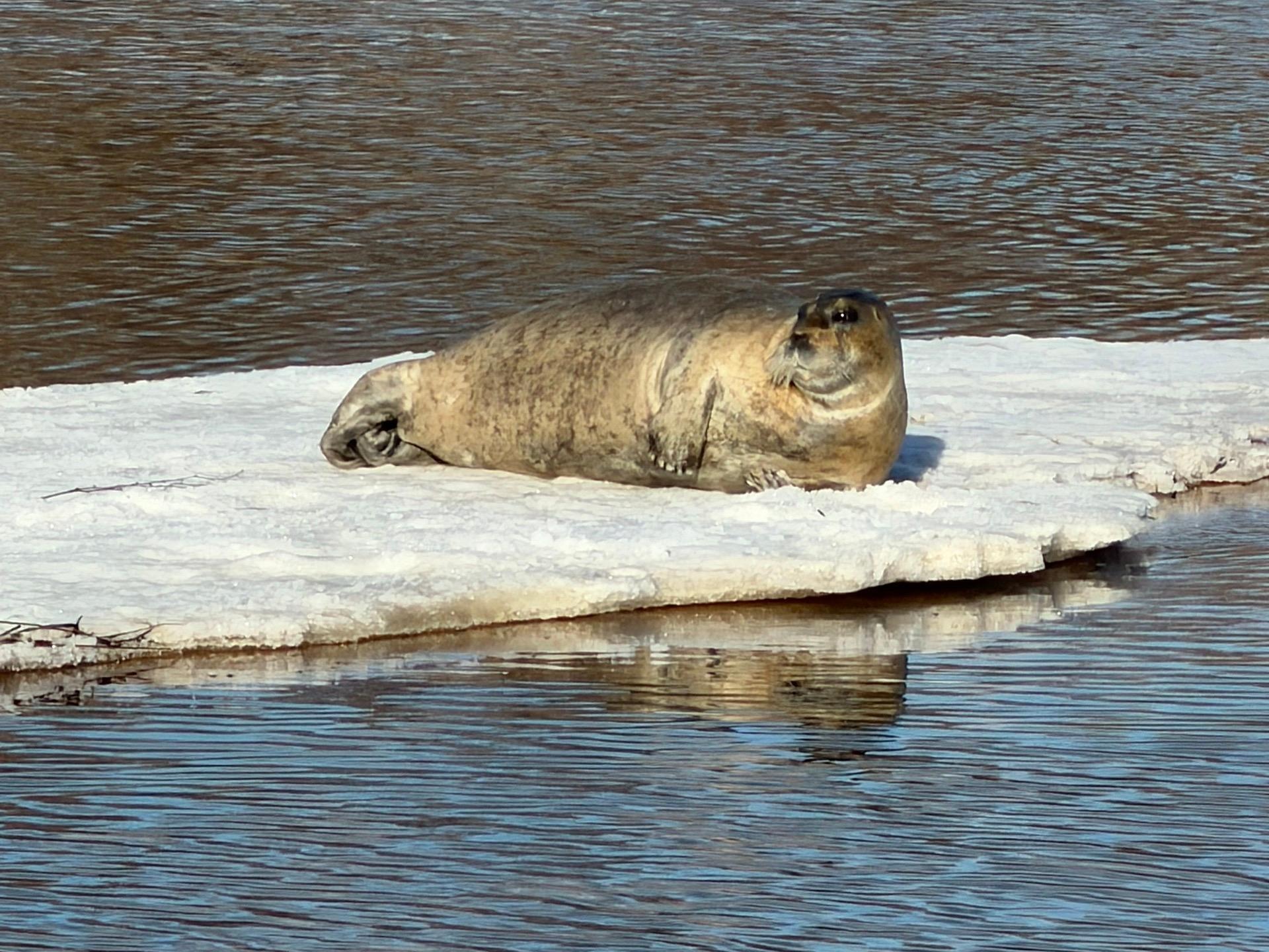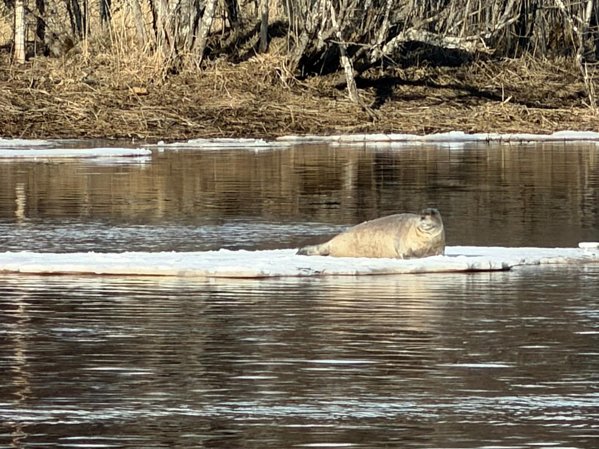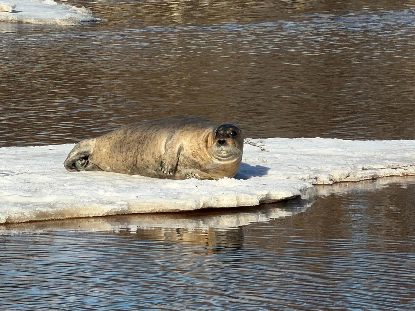 На реке Лодьма в Приморском округе Архангельской области заметили тюленя, который отдыхал на льдине и позировал перед камерой.