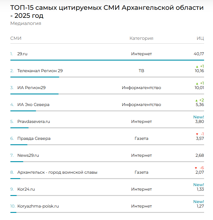 Рейтинг самых цитируемых средств массовой информации Архангельской области по итогам 2025 года вновь возглавил сайт 29.RU. Данные подготовила аналитическая компания «Медиалогия».