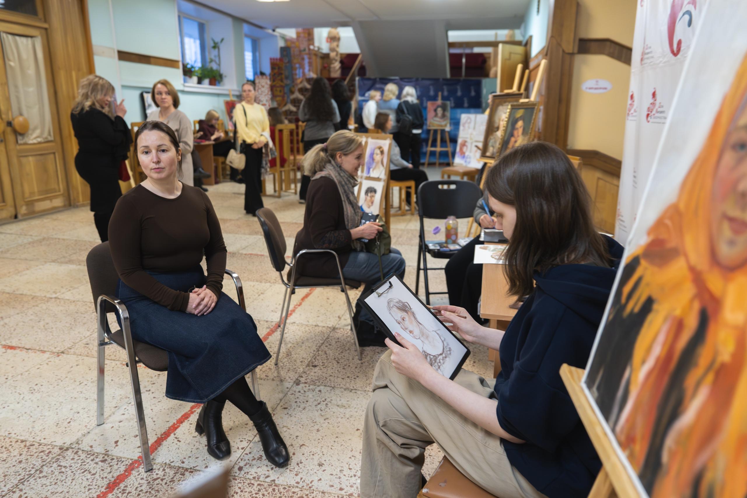 Студентки колледжа культуры рисовали для зрителей быстрые портреты.