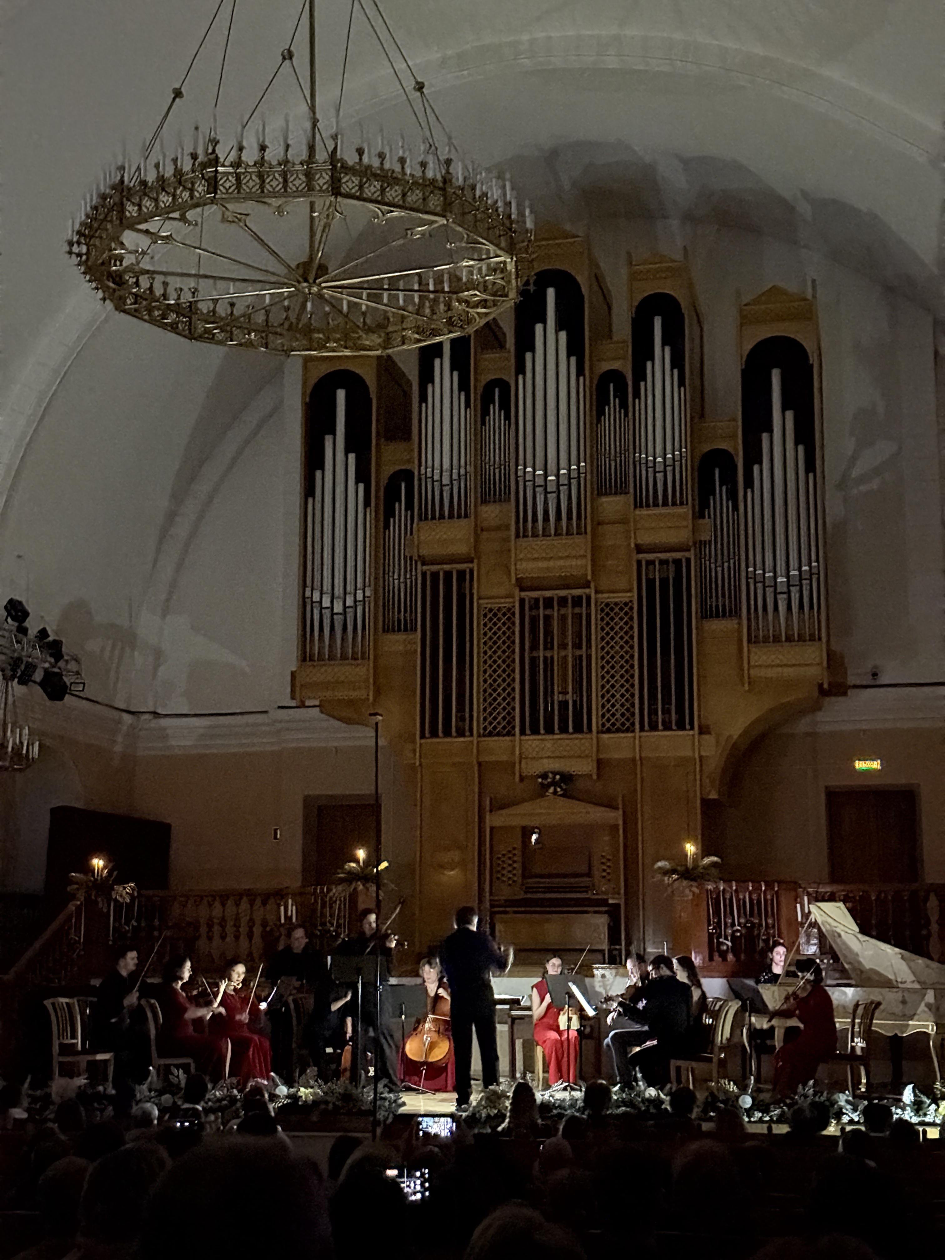 Музыканты камерного оркестра не прекратили исполнение, даже когда в зале погас свет. Зрители засняли происходящее на видео.