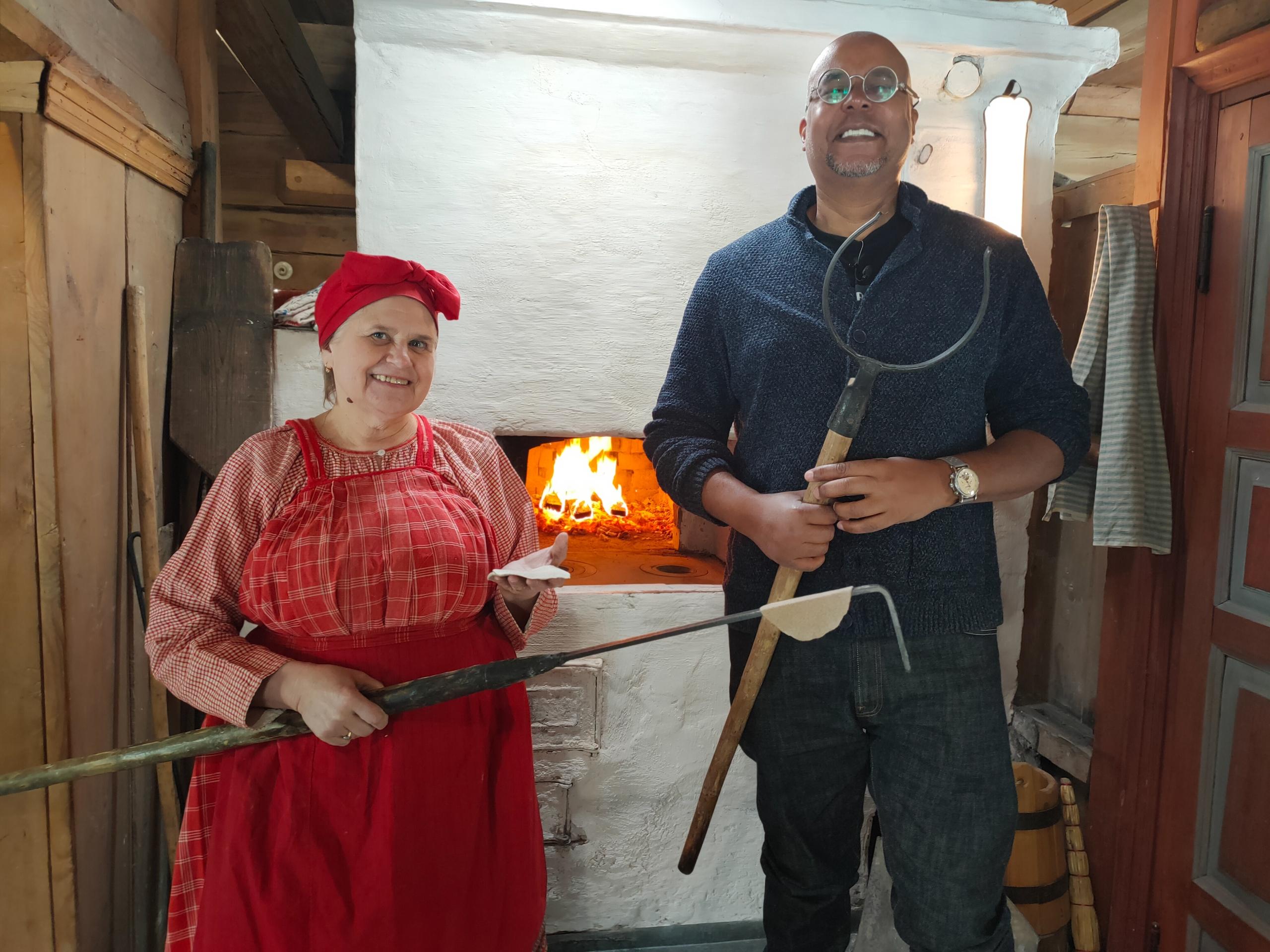 Ведущий Антон Зайцев вместе с сотрудницами отдела этнографических программ Ольгой Знатных и Ириной Лоренц испек лешуконские козули и каргопольский калач на кочерге в русской печи. Затем он продегустировал поморский рыбник и заспяны калитки.