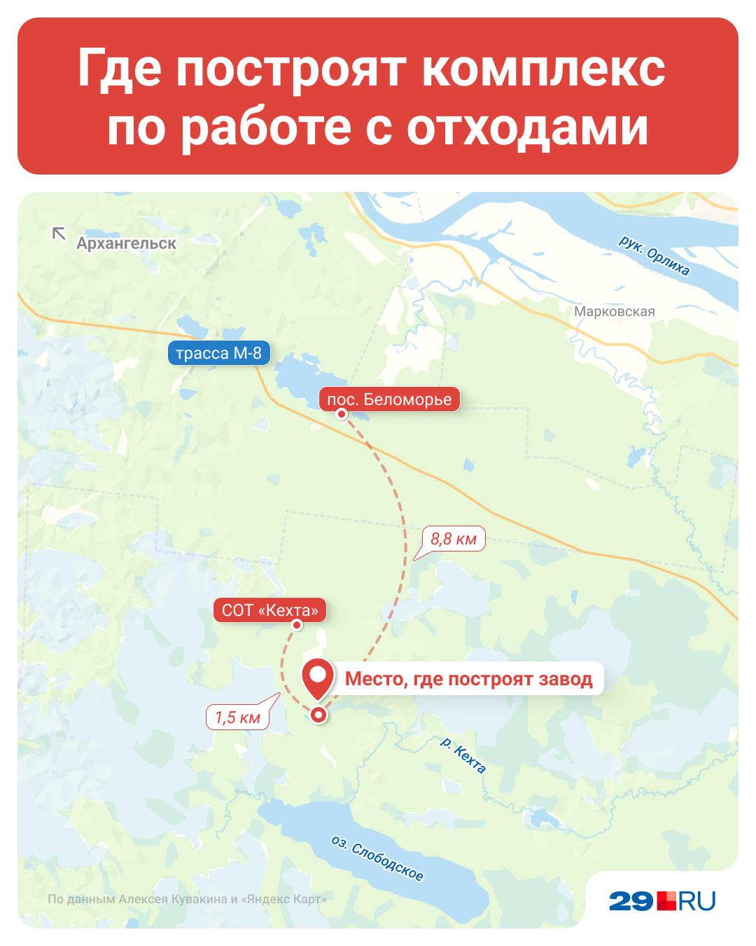 Советник губернатора Архангельской области по экологическим вопросам Алексей Кувакин объяснил сложность выбора площадки: «Очень тяжело было, когда мы подбирали участок, нужно было соблюсти очень многие моменты. Население не хочет видеть комплекс близко к населённым пунктам. И это правильно: всё-таки это промышленный объект, это реальный завод. При этом на заводе должны работать люди, туда должны привозить сырье, поэтому к нему должна вести хорошая дорога. Энергии в лесу нет, нужно провести линию электропередач. Вокруг есть реки, озера, подземные источники и прочее — всё это тоже учтено. Данный участок — самый ближайший с точки зрения развития инфраструктуры крупной агломерации».