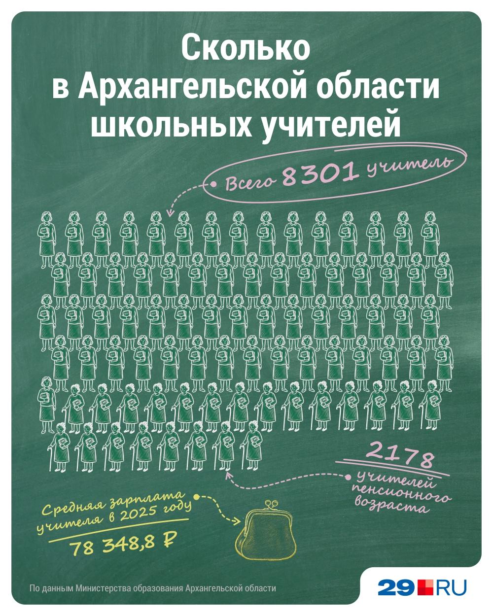 Согласно предоставленным данным, в настоящее время в школах Поморья работает 8301 учитель. Из них 2178 человек, то есть более 26%, уже достигли пенсионного возраста, но продолжают трудовую деятельность.