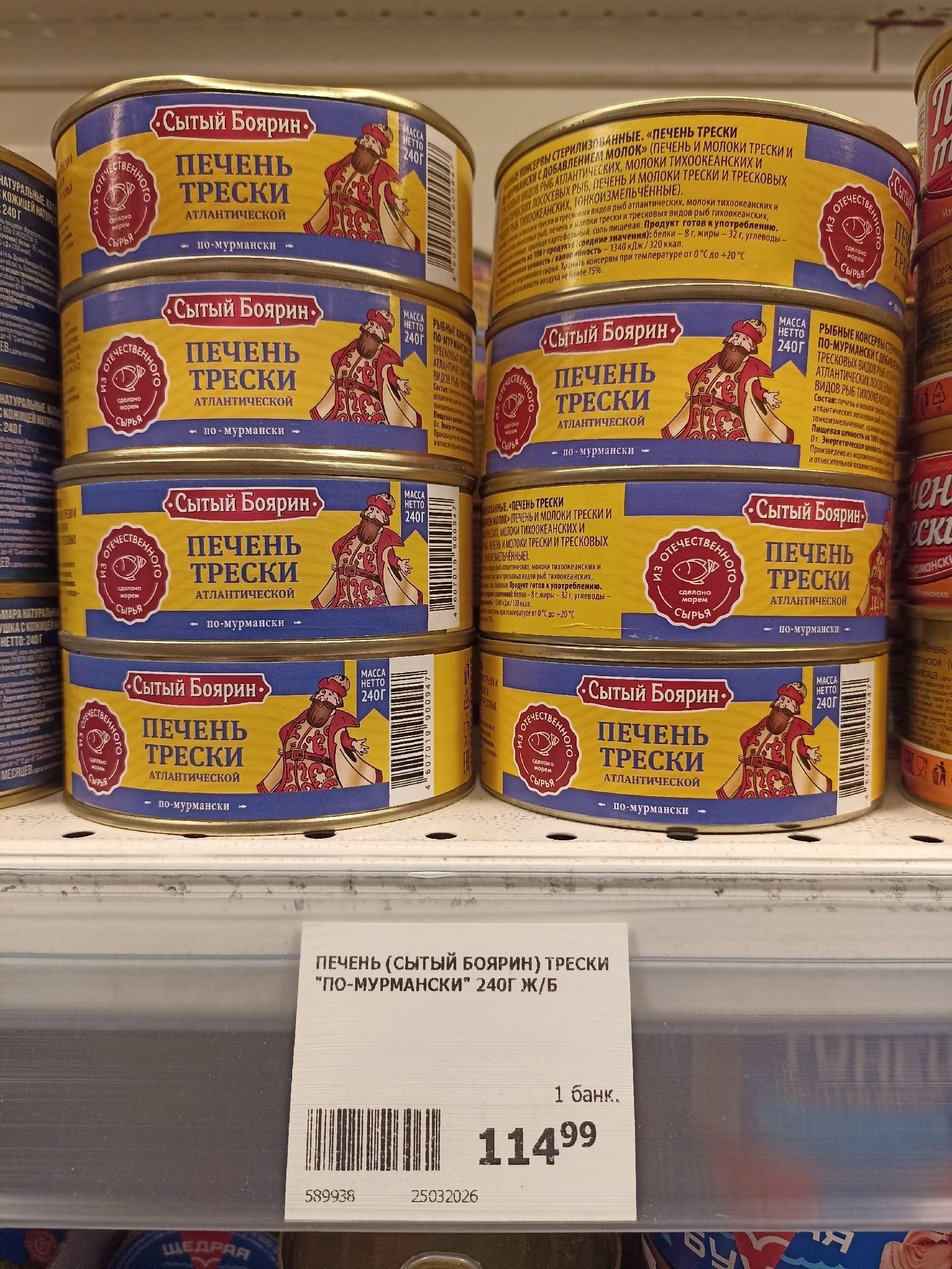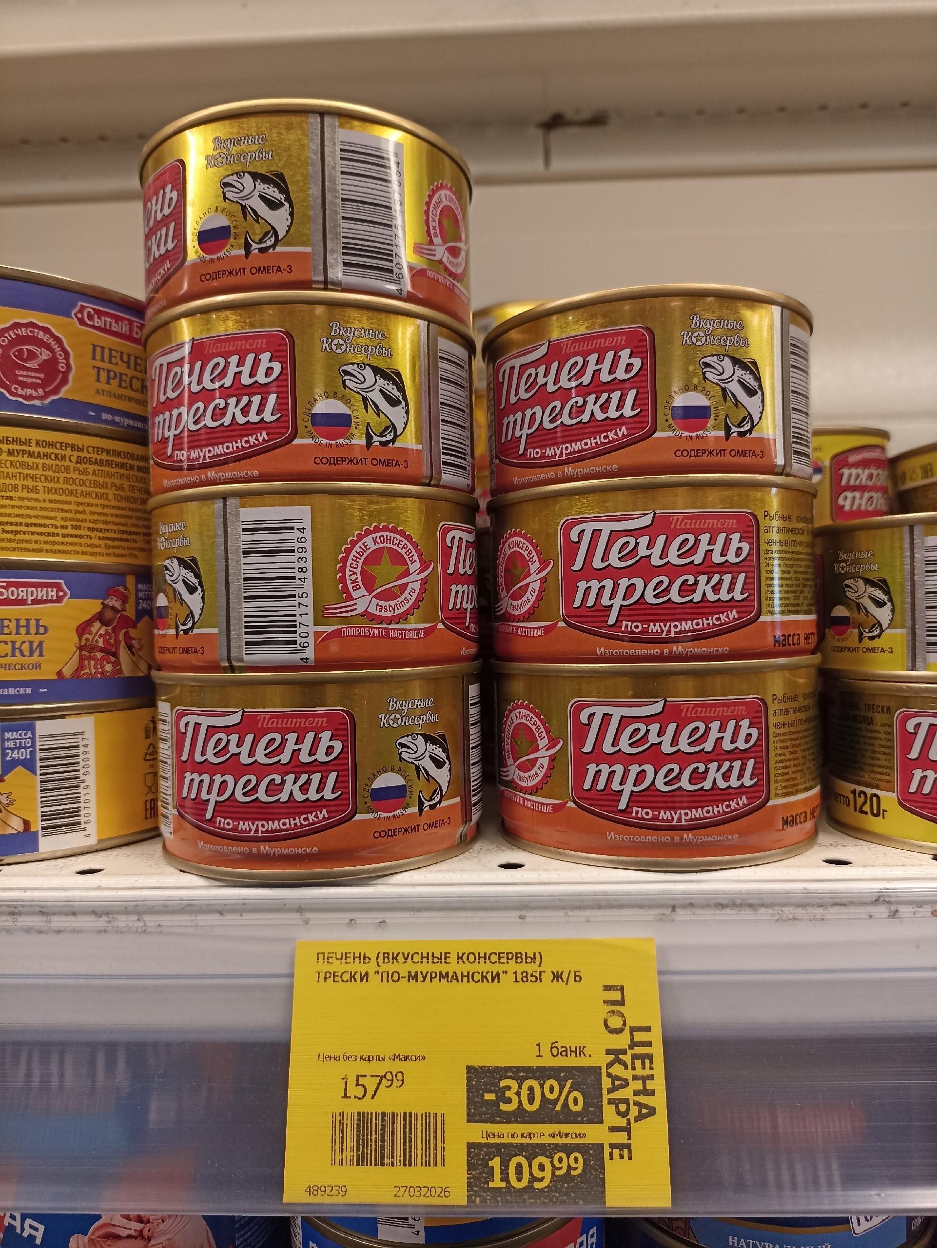 Также в продаже имеется печень трески «по-мурмански» — это не куски, а паштет из печени. Стоимость таких банок составляет от 110 до 115 рублей.