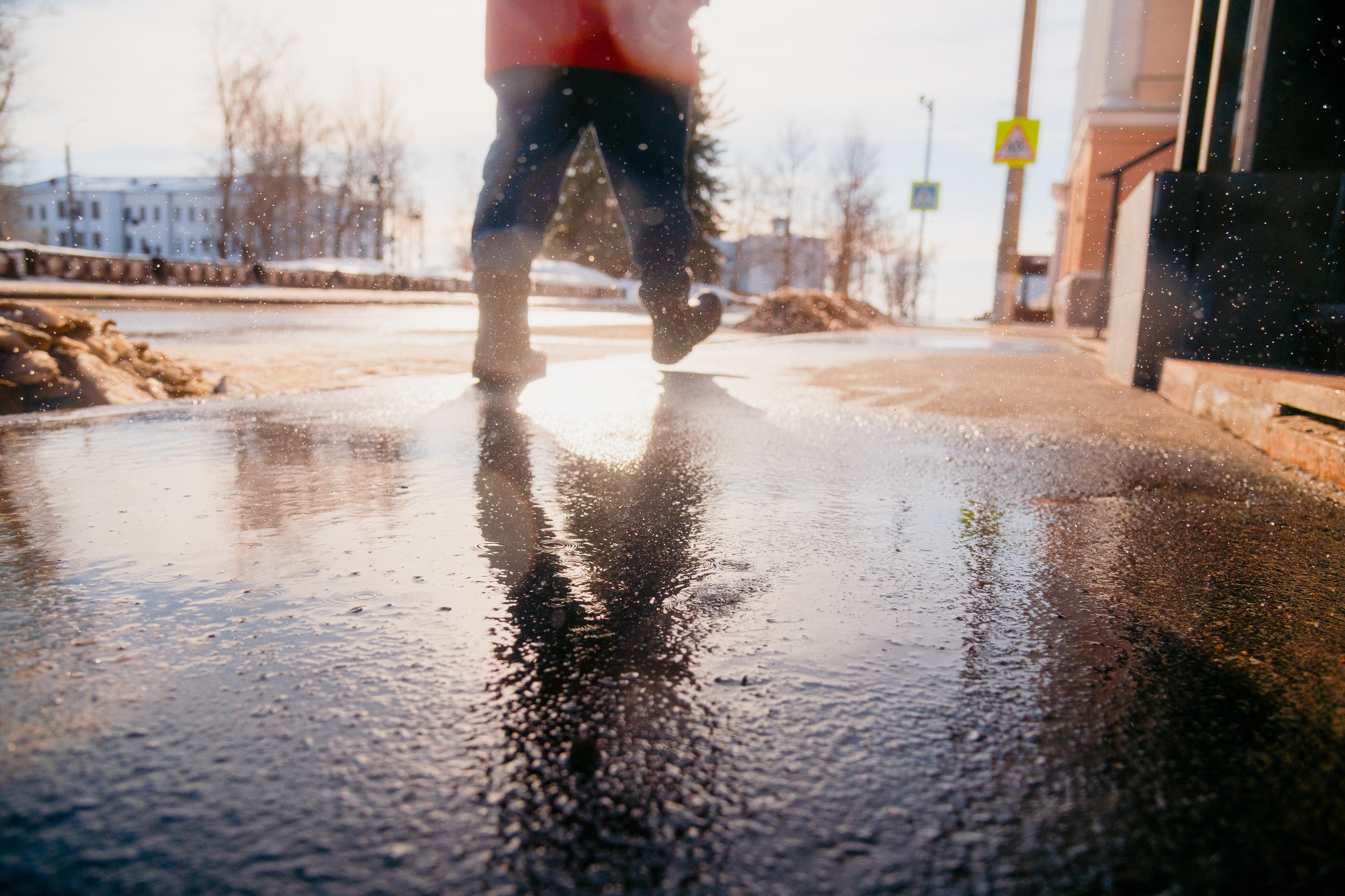 Мартовская оттепель в Архангельске привела к тому, что на дорогах и тротуарах одновременно соседствуют высокие сугробы, глубокие лужи и скользкий лед.