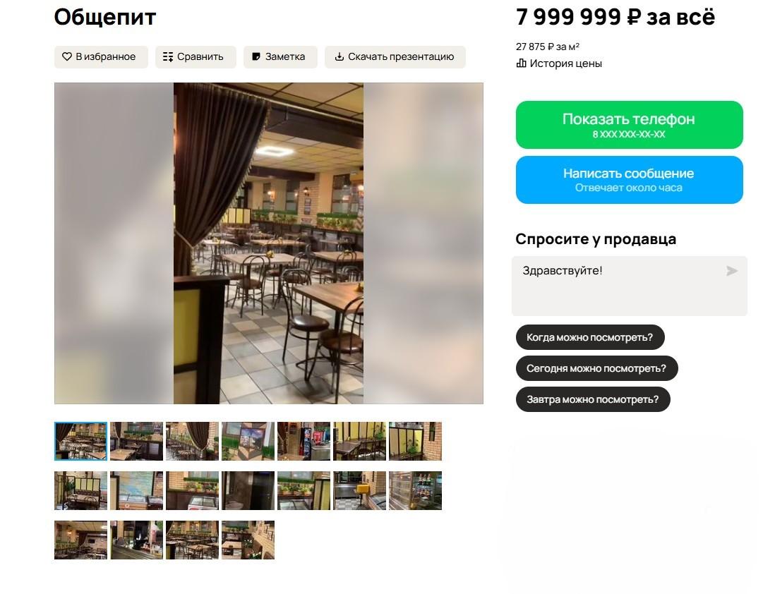 Владелец запрашивает за объект 8 млн рублей. «В связи с переездом продается уютное действующее кафе-столовая с большим банкетным залом. Шеф повар и персонал, в том числе 3 бухгалтера, готовы продолжить успешную работу», — говорится в описании объявления.