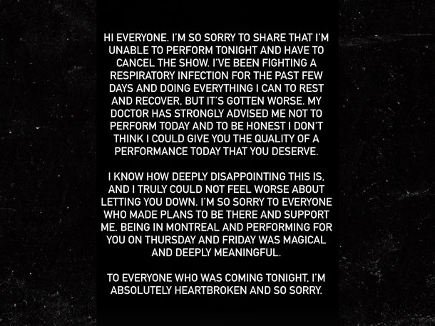 Gaga сообщила новость в истории, заявив, что её фанаты заслуживают только самого лучшего, а сейчас она не может этого дать. Она понимает, как это неприятно для всех, кто пришёл на её последний концерт в Канаде.