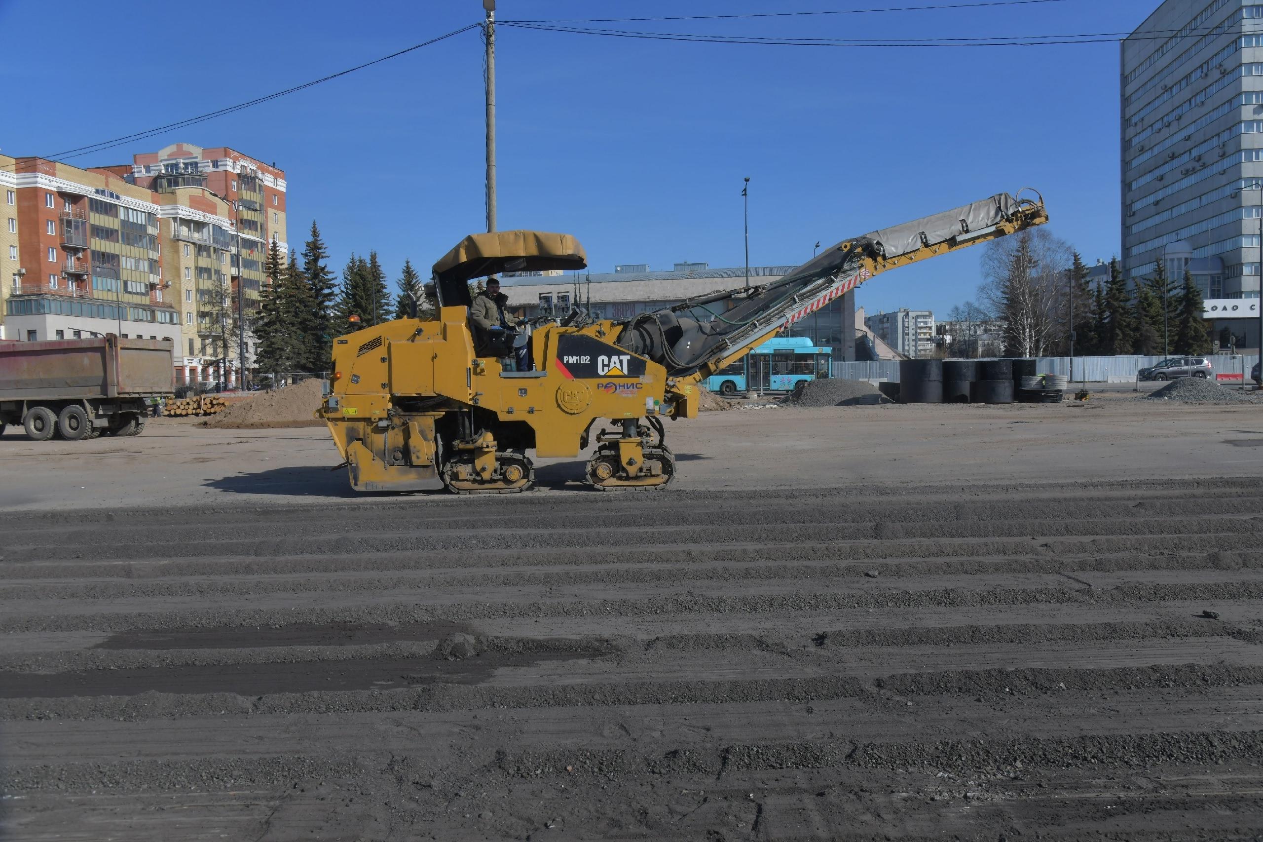 На площади Профсоюзов в Архангельске идёт срезка старого асфальта для создания пешеходной зоны. Летом здесь также отремонтируют проезжую часть.