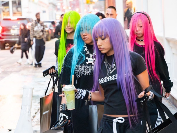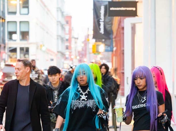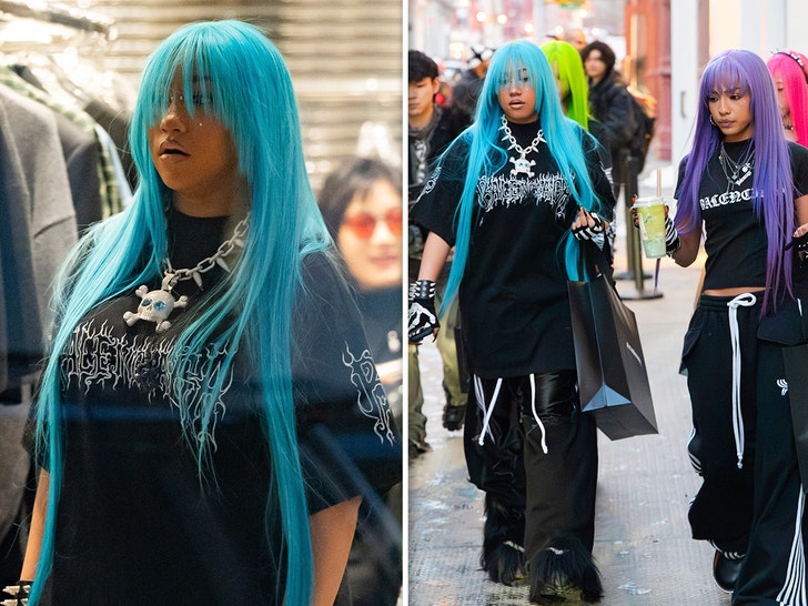 Будущее North West выглядит ярким, как и её волосы. В субботу она вышла в Нью-Йорке, щеголяя ярким париком, в компании друзей, зайдя в магазин Alexander Wang.