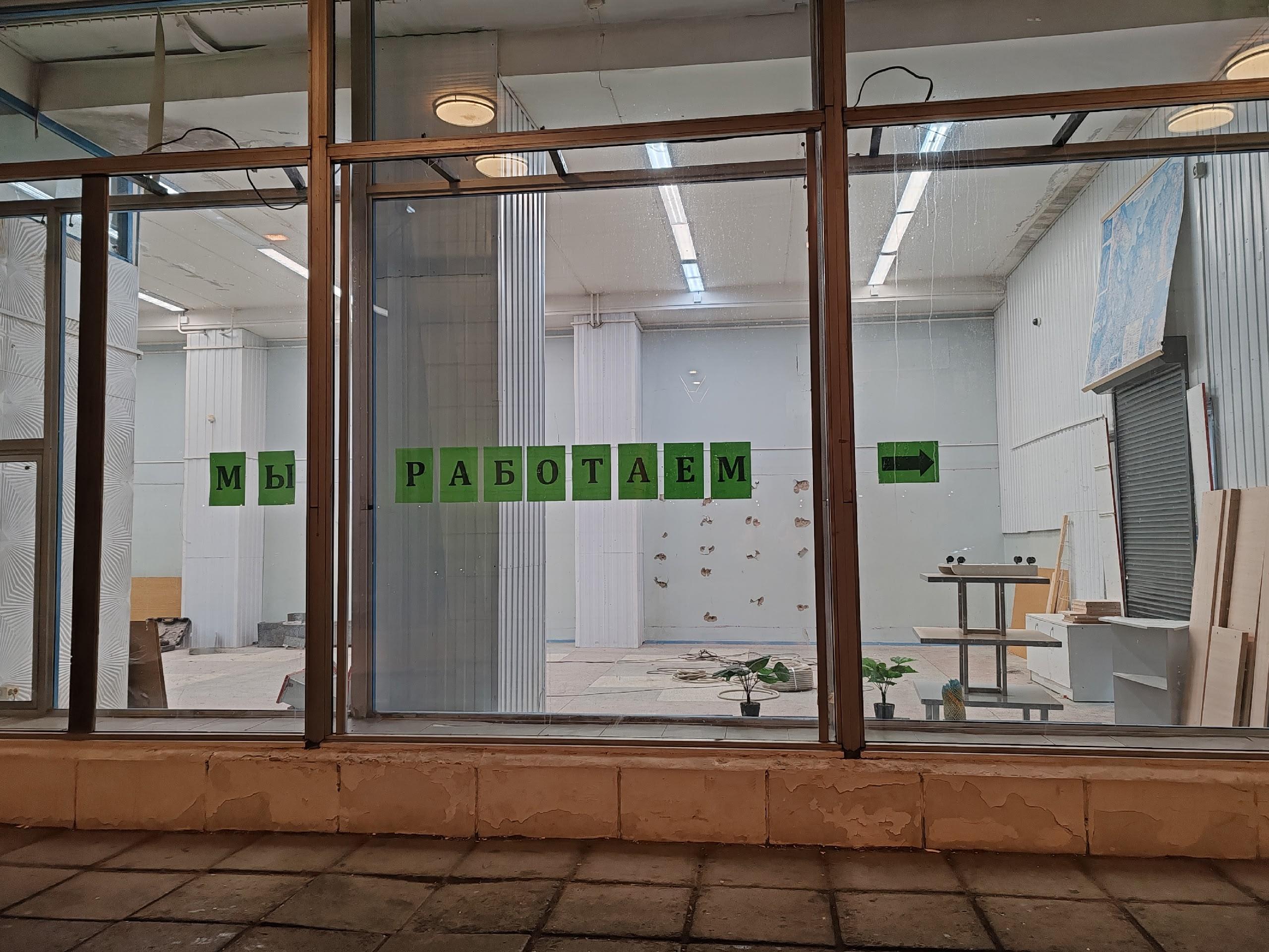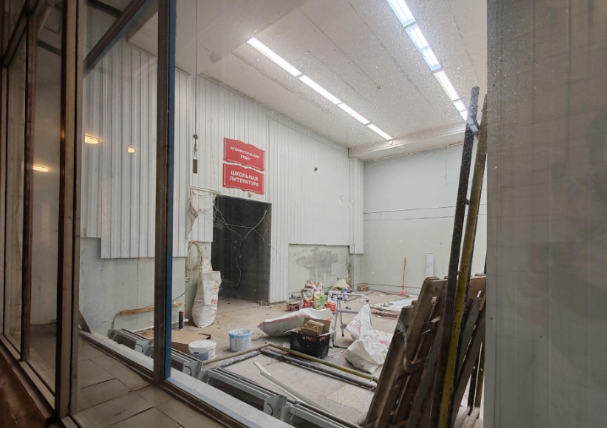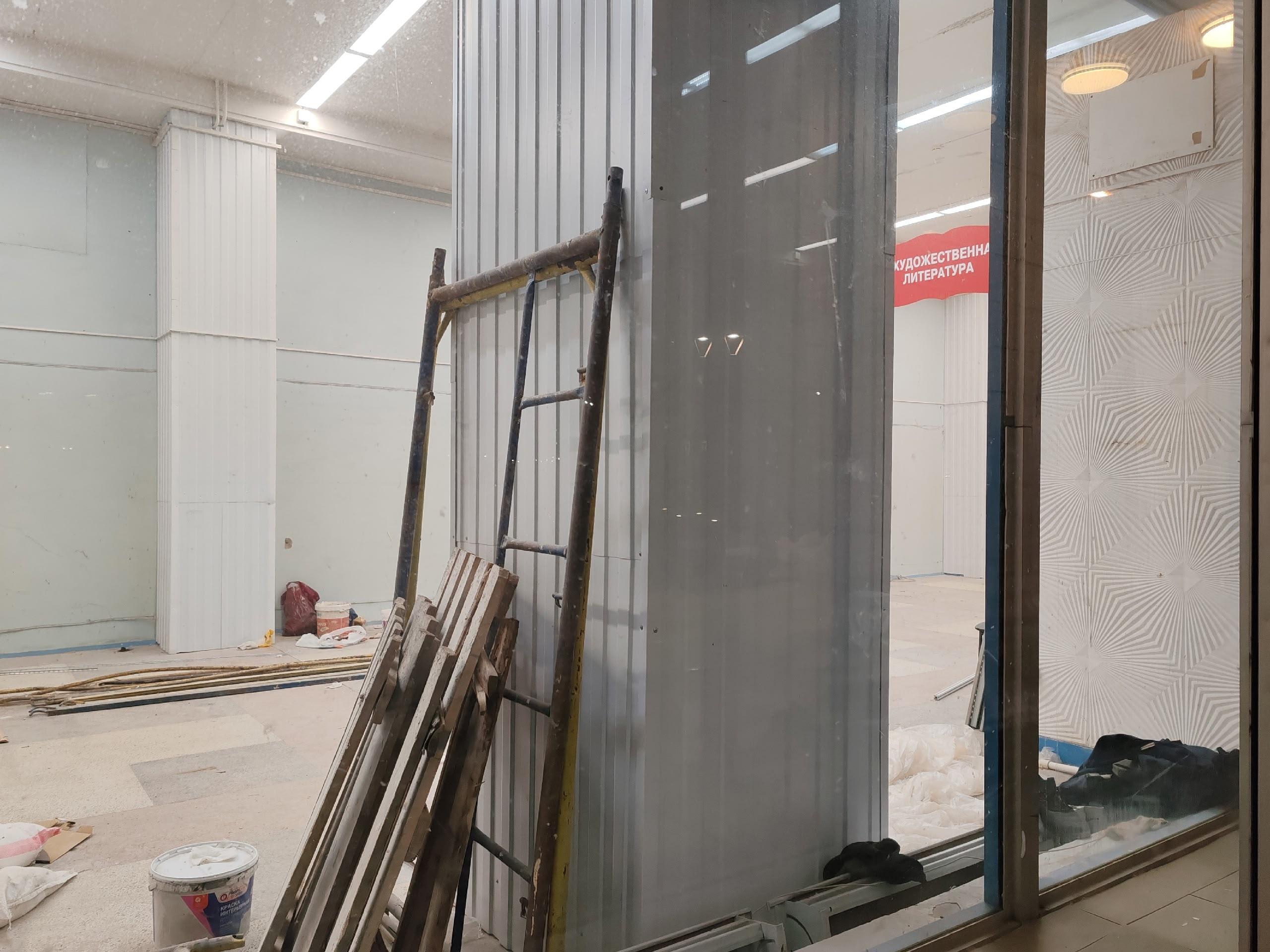 В центре Архангельска в магазине «Дом книги» заметно опустело: через панорамные окна видны разобранные стеллажи и строительный мусор. При этом торговля не прекращается, и на дверях висит табличка «Мы работаем».