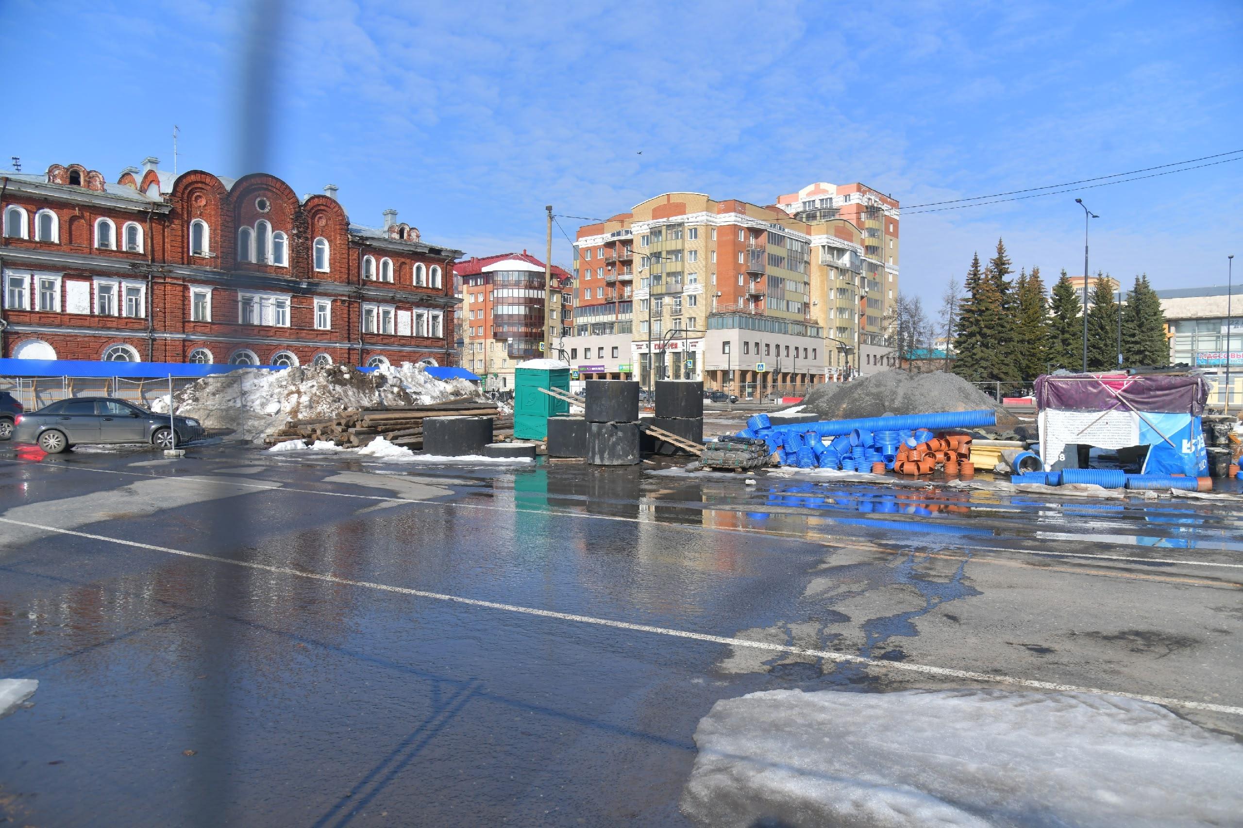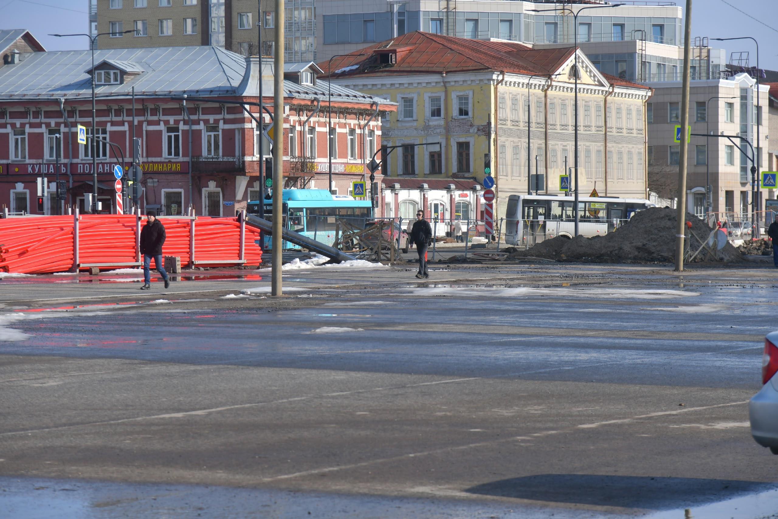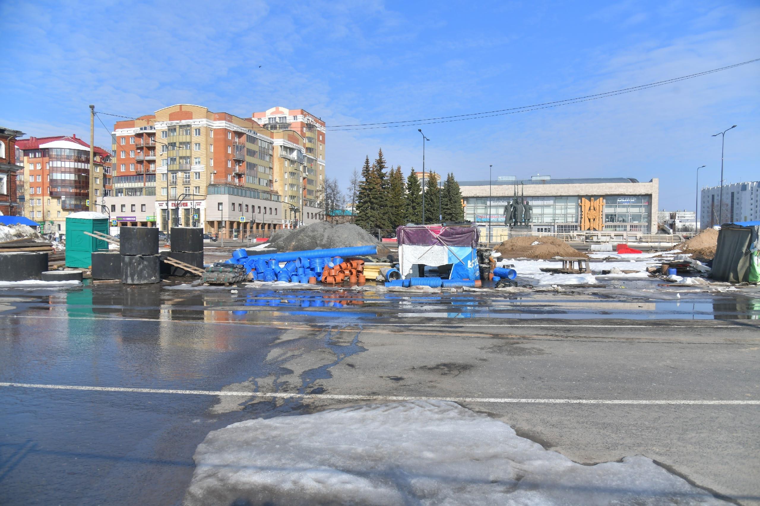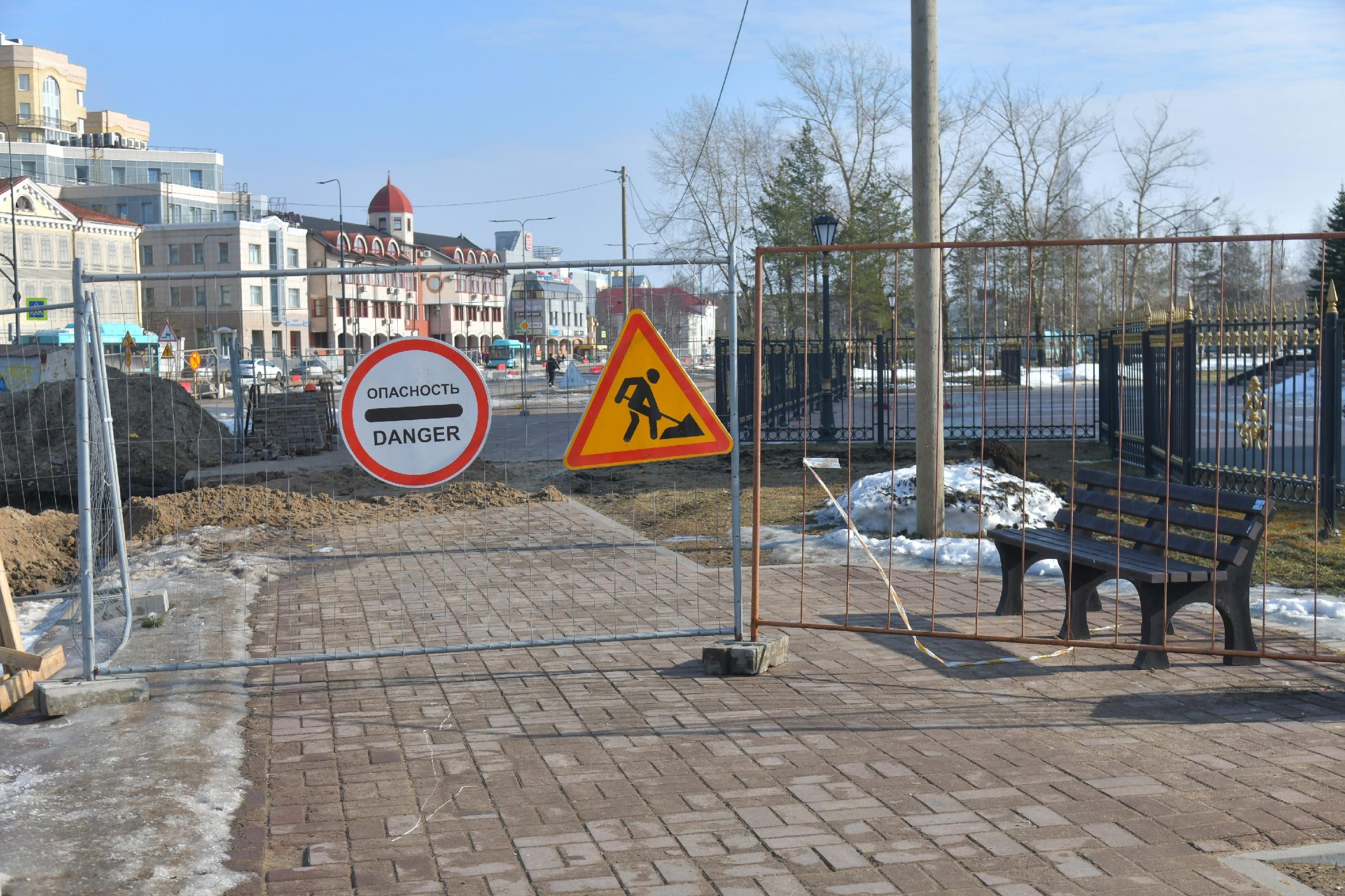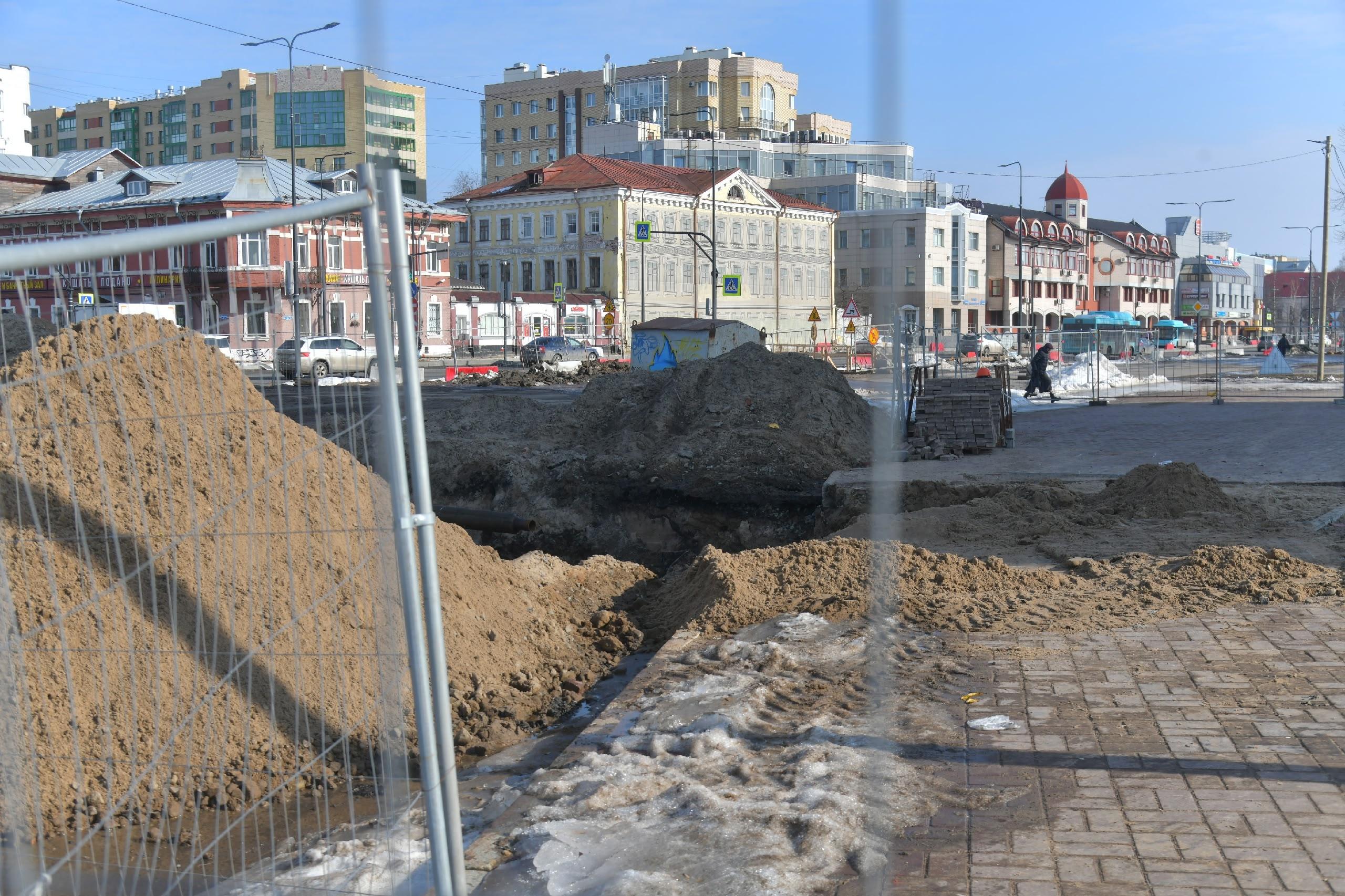 Часть тротуаров на площади перекрыта из-за работ по переустройству теплосетей.