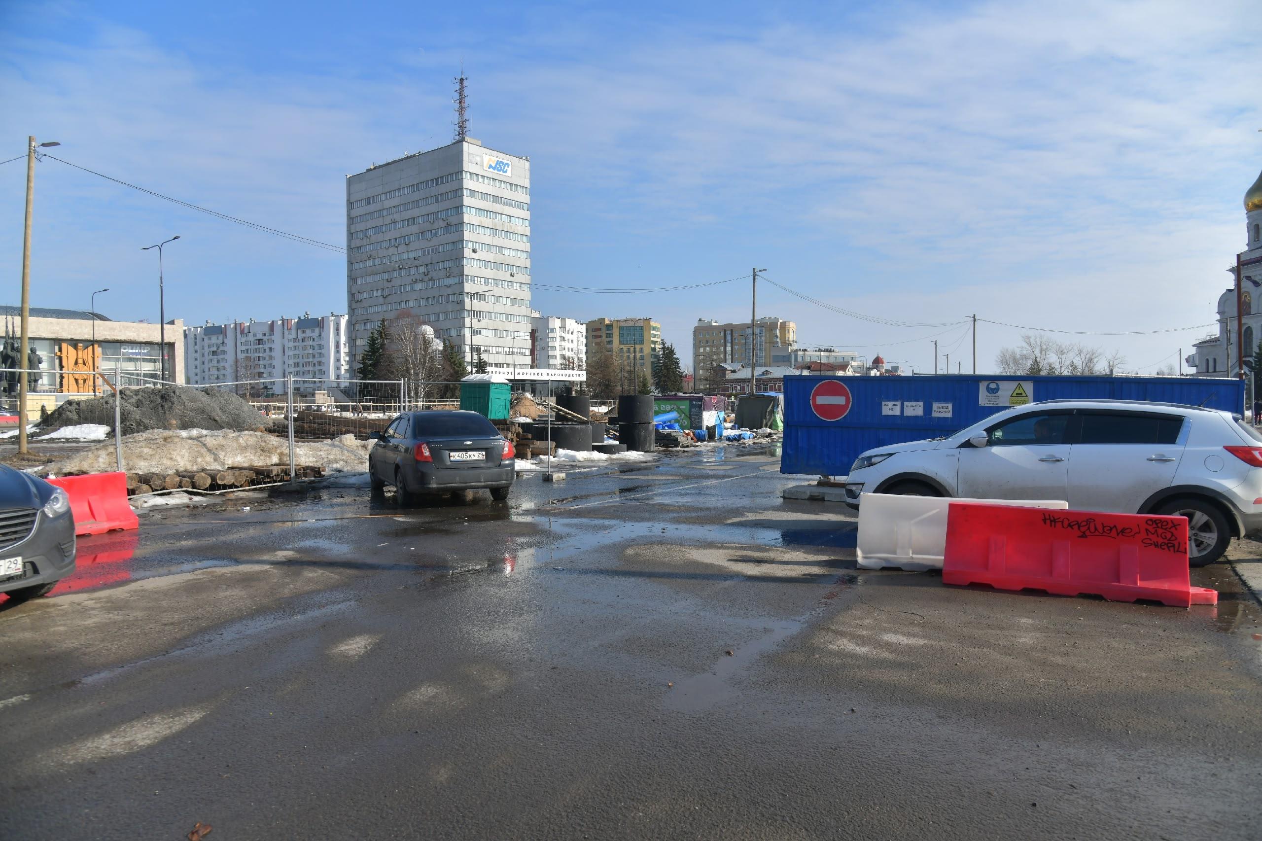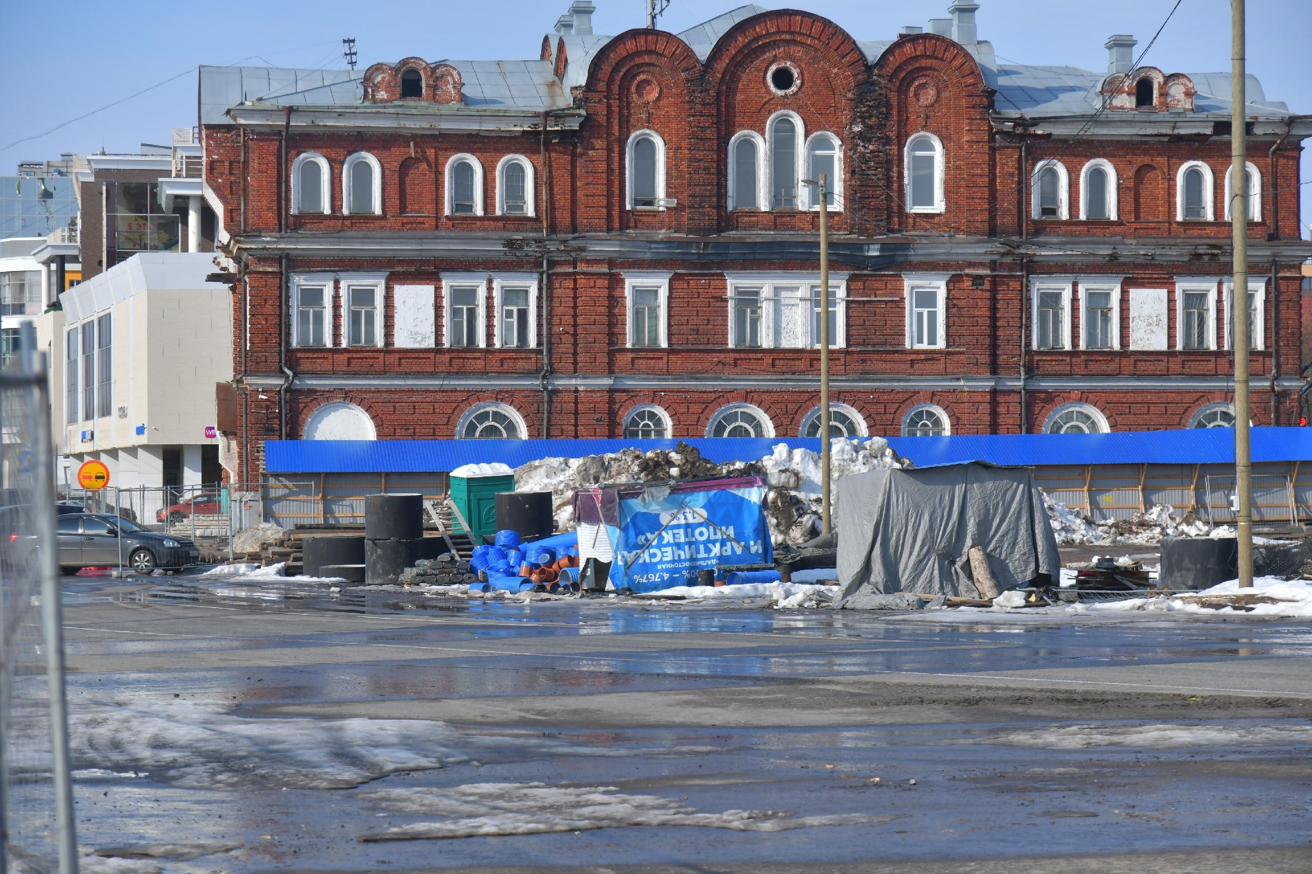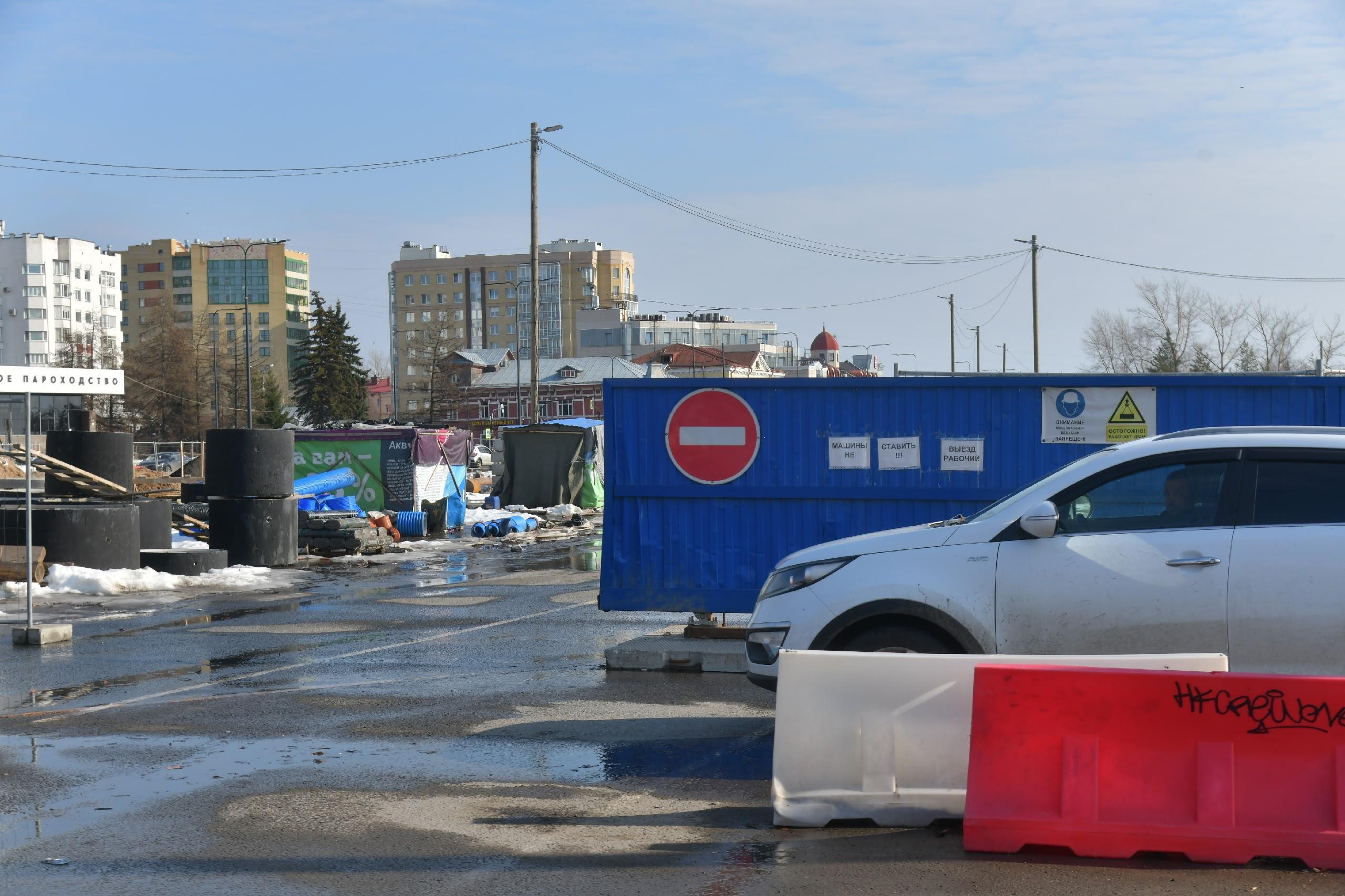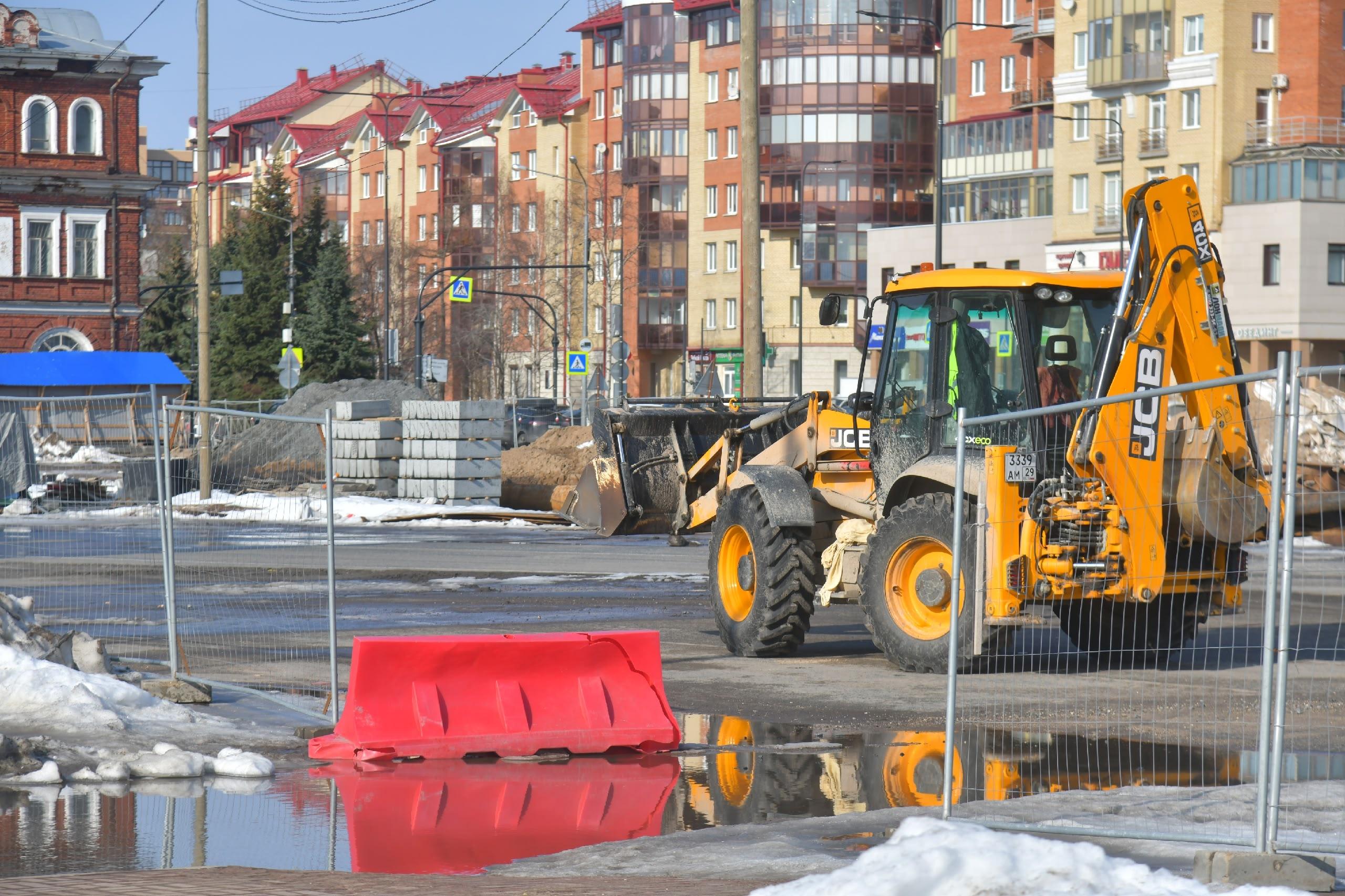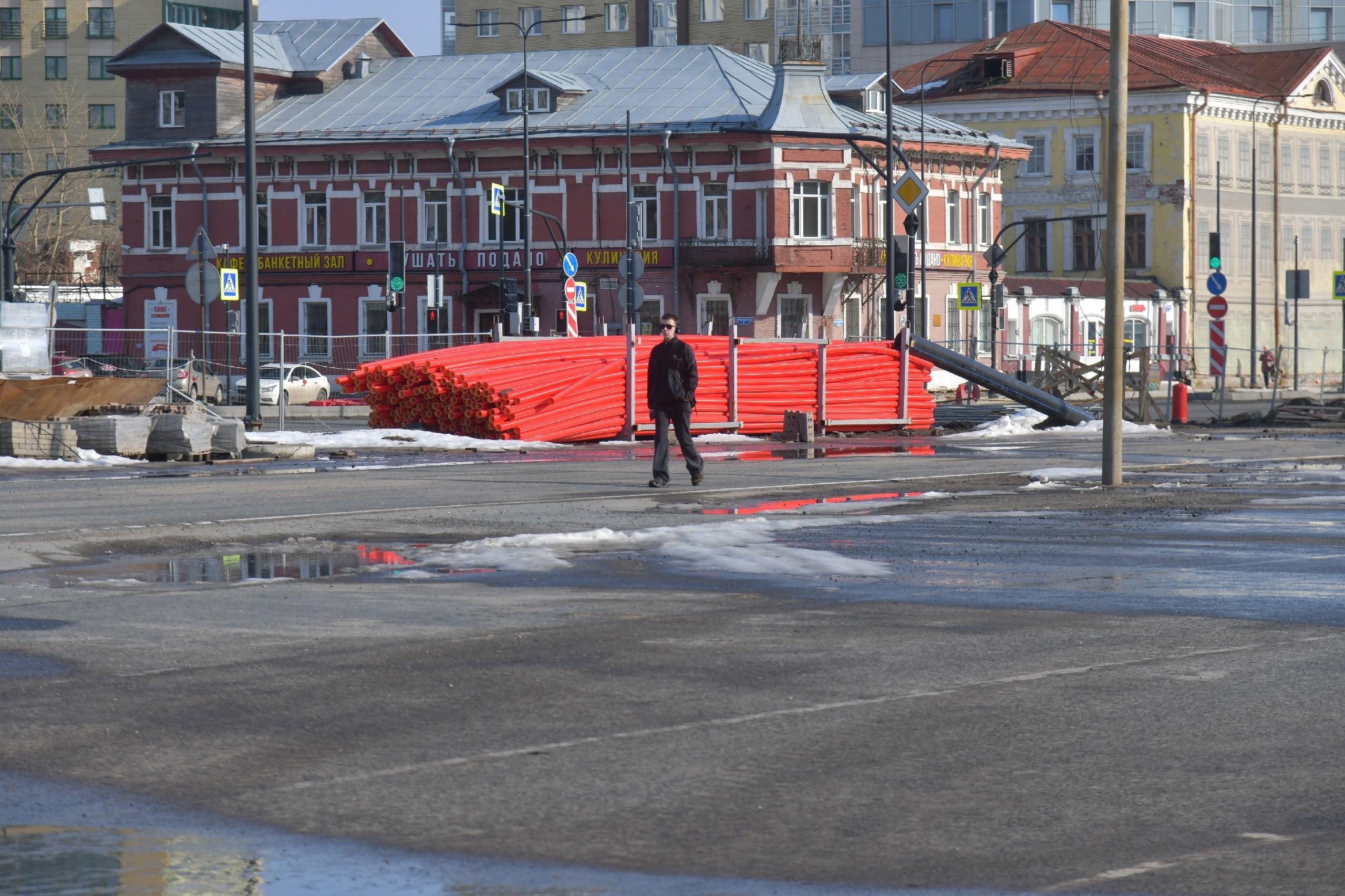 Часть тротуаров на площади перекрыта из-за работ по переустройству теплосетей.