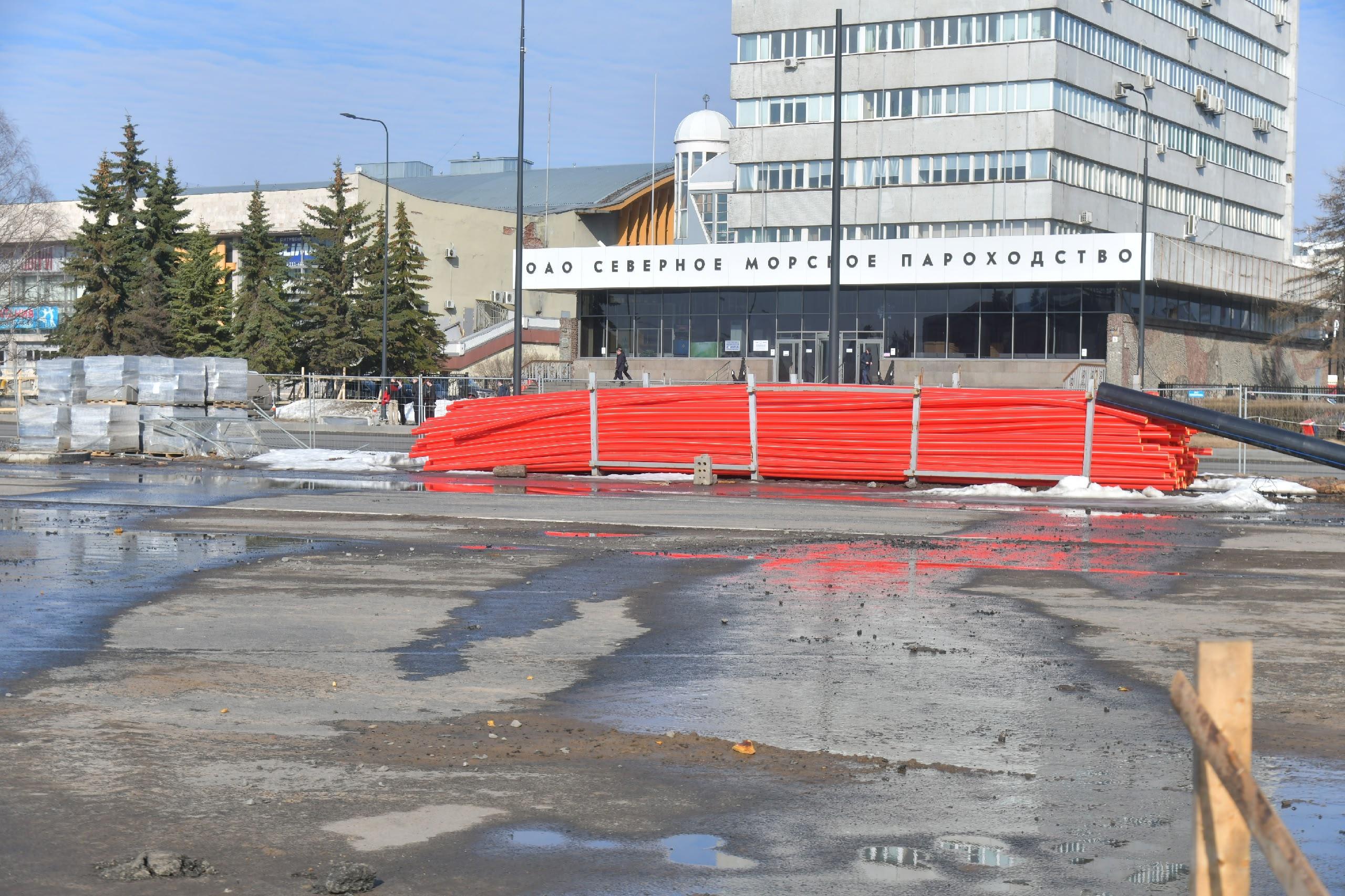 В Архангельске на площади Профсоюзов идёт активная фаза реконструкции. Подрядчик в настоящее время занимается переустройством тепловых сетей, что привело к временному закрытию для пешеходов части тротуара.