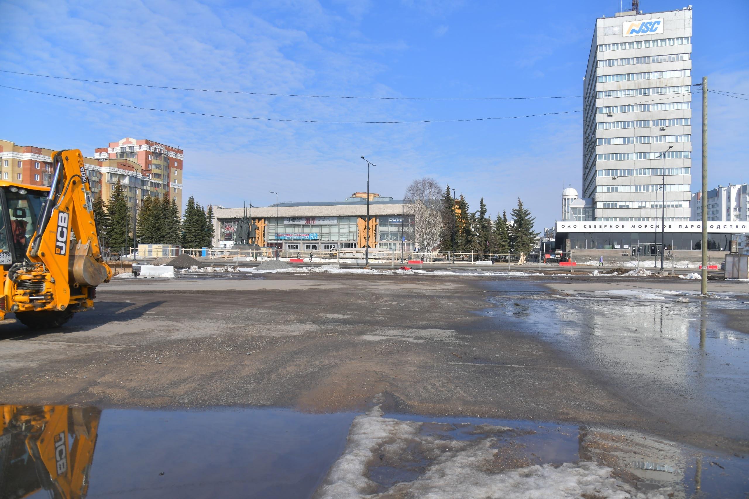 Работы на площади стартовали в 2023 году. В ходе проекта была изменена схема движения транспорта у Морского-речного вокзала, а также проведены археологические изыскания. Специалисты обнаружили более сотни исторических захоронений под асфальтом в районе пересечения улицы Розы Люксембург и набережной Северной Двины. Найденные артефакты впоследствии стали частью выставки в Гостиных дворах. После открытия проезжей части в 2025 году на этом участке временно возникали пробки, что побудило власти отрегулировать работу светофоров и скорректировать схемы движения на отдельных перекрёстках города.