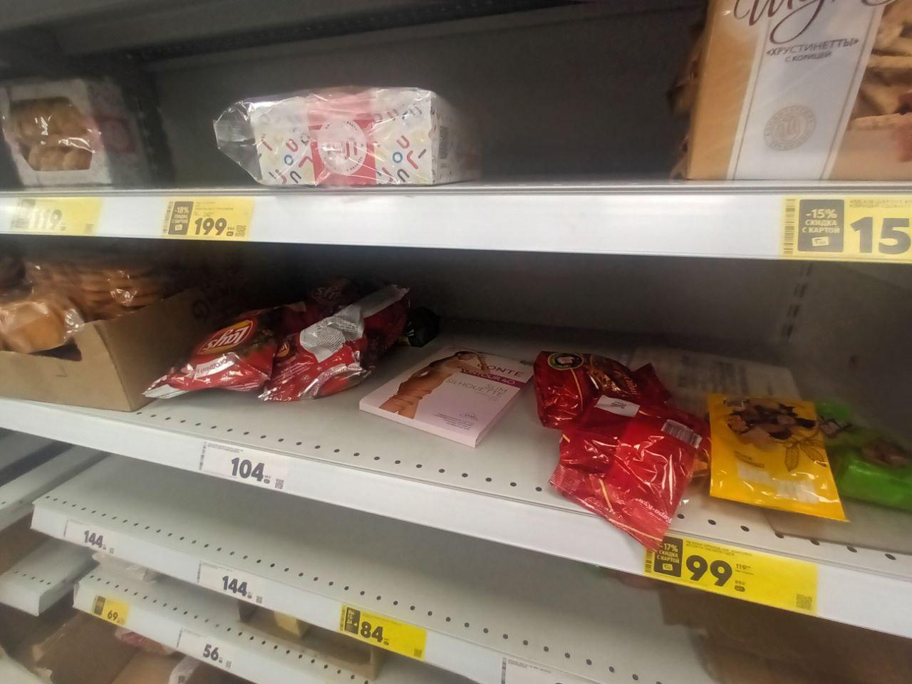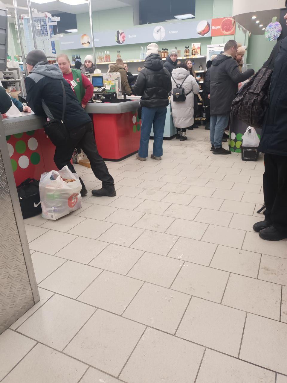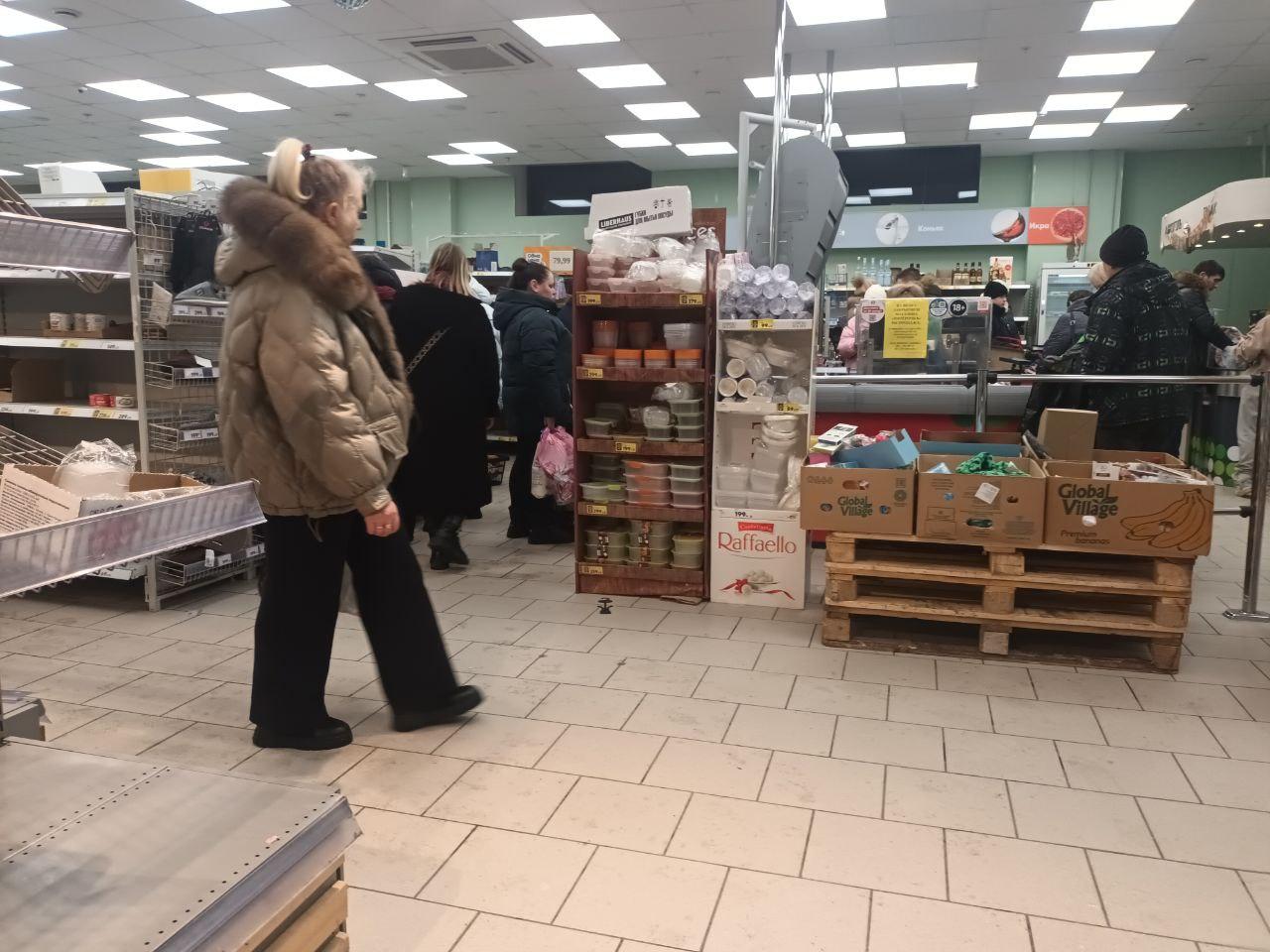 Продавцов-консультантов в зале нет: за кассами находятся только три сотрудника. Из динамиков продолжает звучать реклама акций, хотя часть из них начнёт действовать уже после закрытия магазина и вряд ли заинтересует покупателей, запасающихся, судя по всему, на месяцы вперёд.