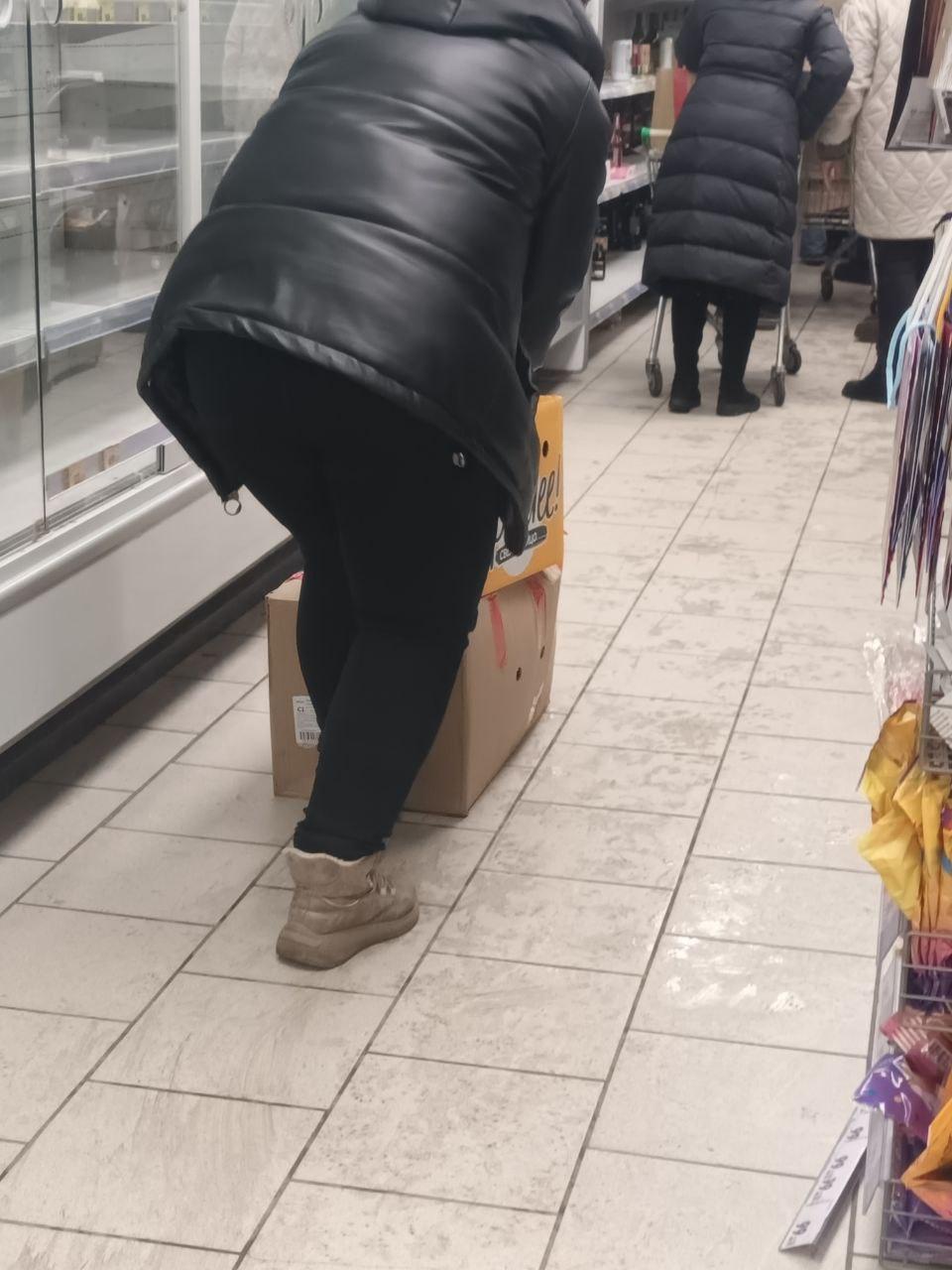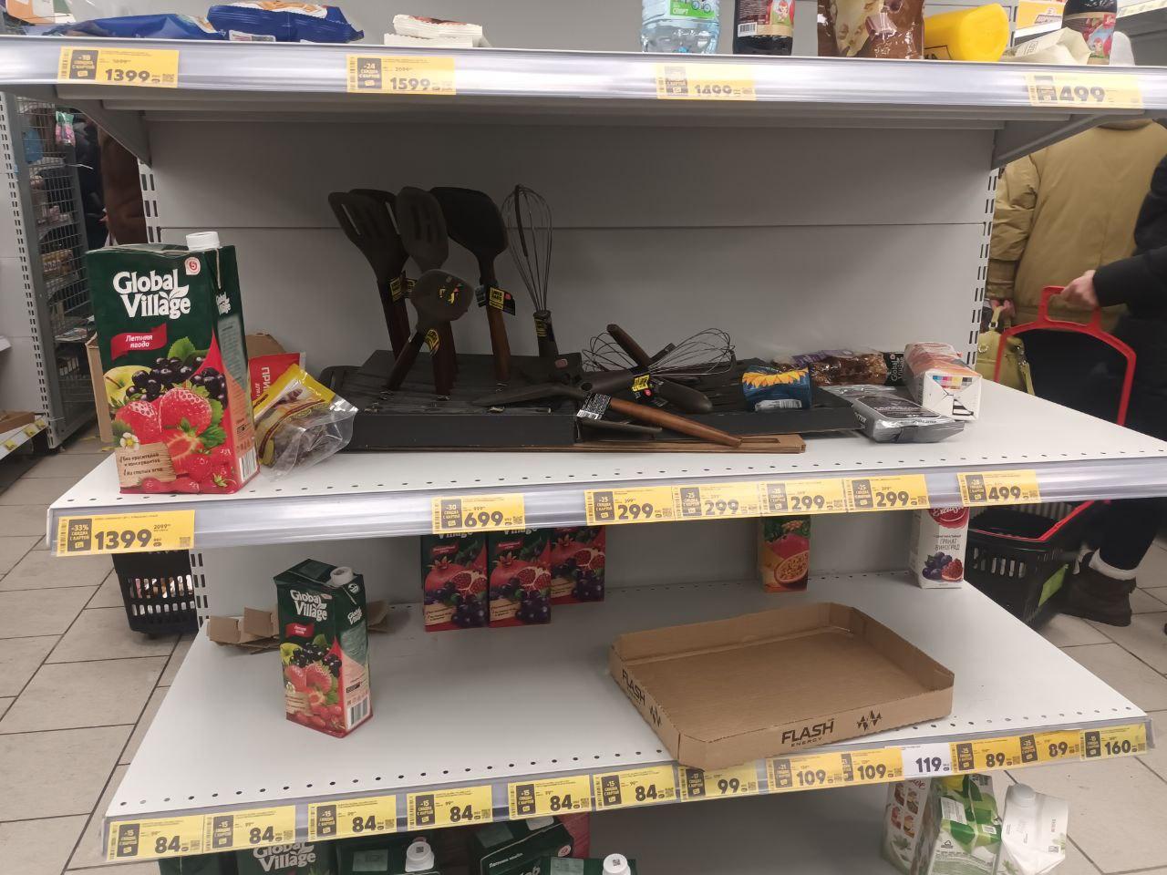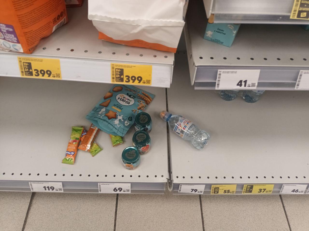 Продавцов-консультантов в зале нет: за кассами находятся только три сотрудника. Из динамиков продолжает звучать реклама акций, хотя часть из них начнёт действовать уже после закрытия магазина и вряд ли заинтересует покупателей, запасающихся, судя по всему, на месяцы вперёд.