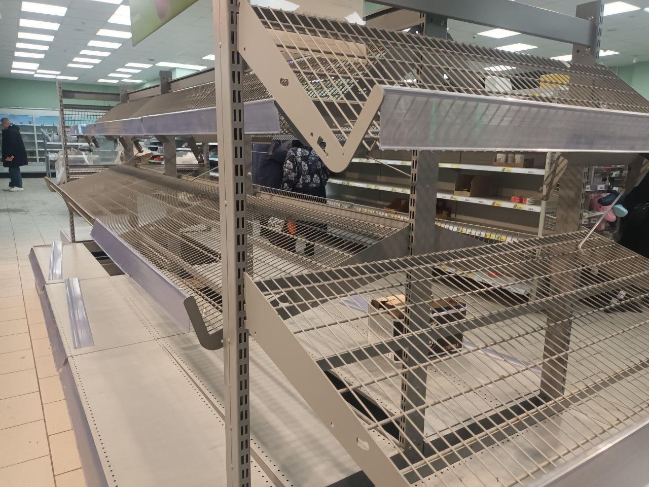 Некоторые посетители, зайдя внутрь, окидывают взглядом опустевшие стеллажи и длинные очереди и вскоре покидают магазин.