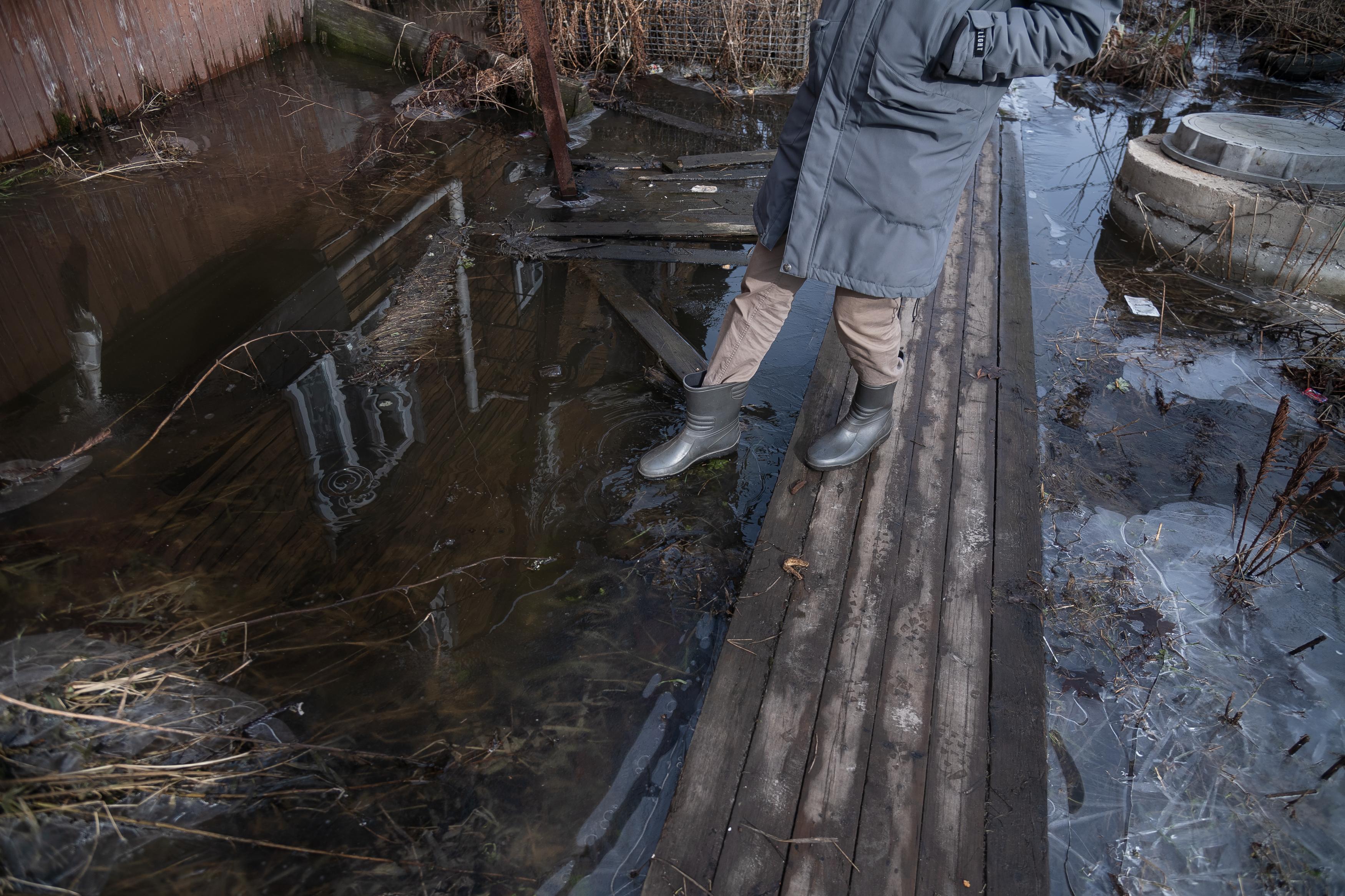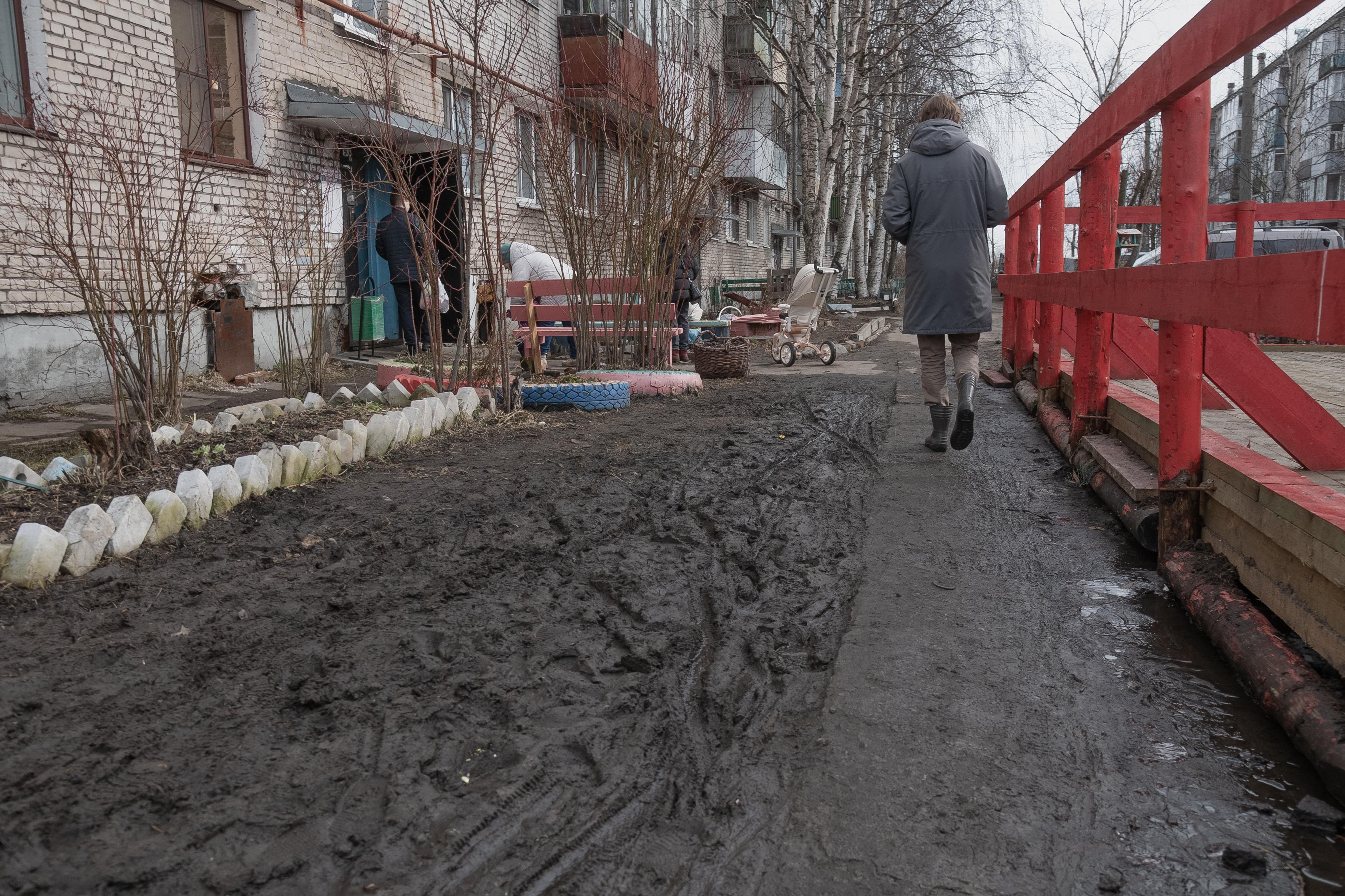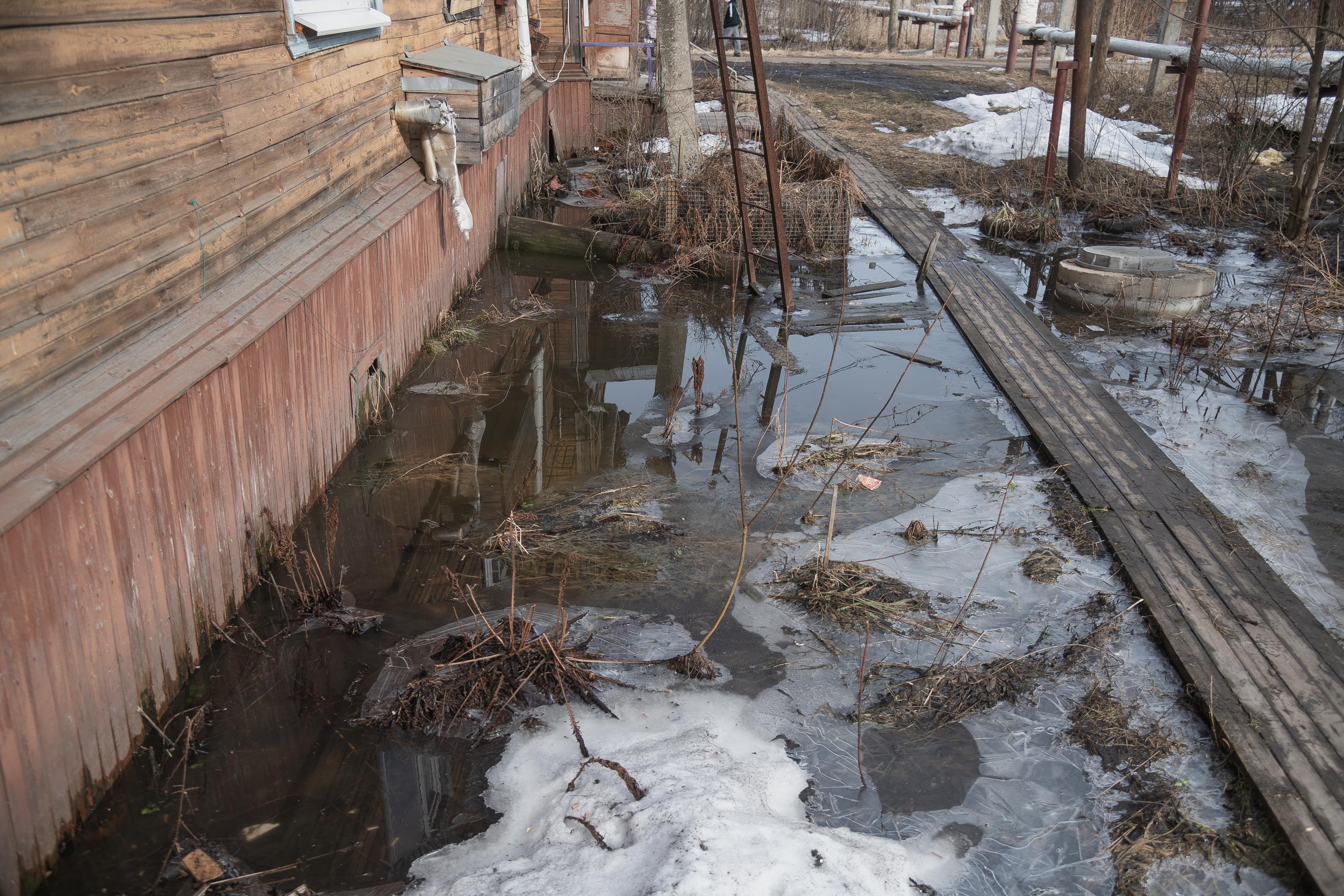 Глубокие лужи сохраняются вокруг домов даже в отсутствие дождя.