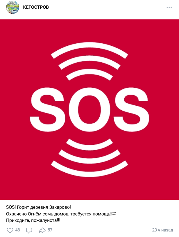 Призыв о помощи в тушении пожара в группе жителей острова ВКонтакте.