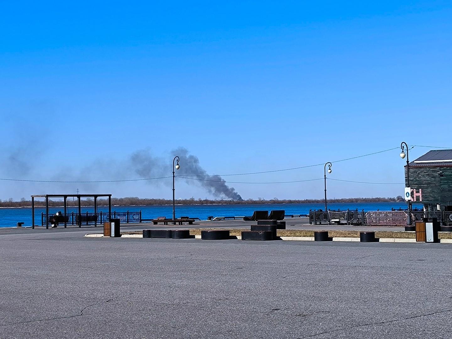 Вид на столб дыма от пожара из центра Архангельска.