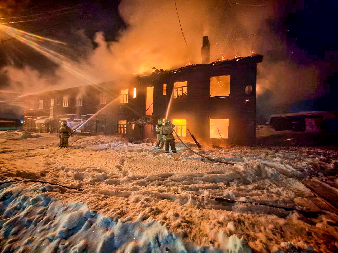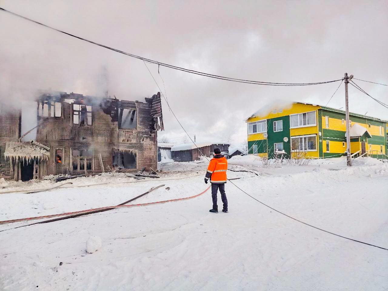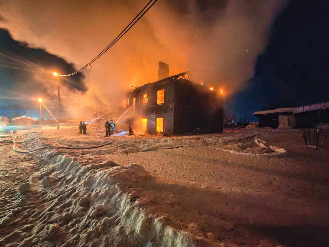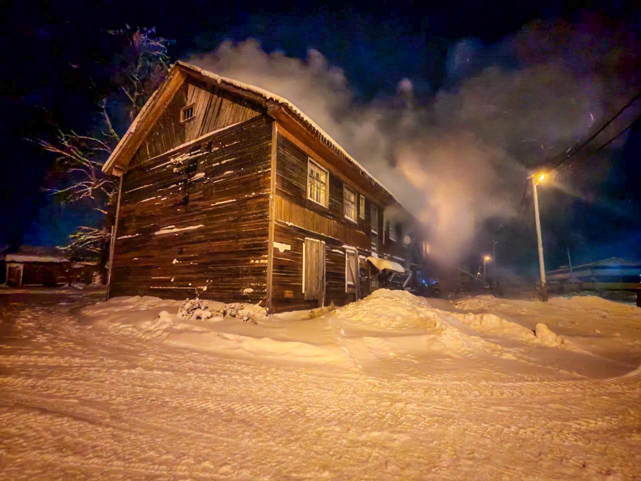 В ночные часы в посёлке Коноша Архангельской области произошло возгорание в двухэтажном деревянном доме. Пламя создавало угрозу для хозяйственных построек и соседнего жилого здания.