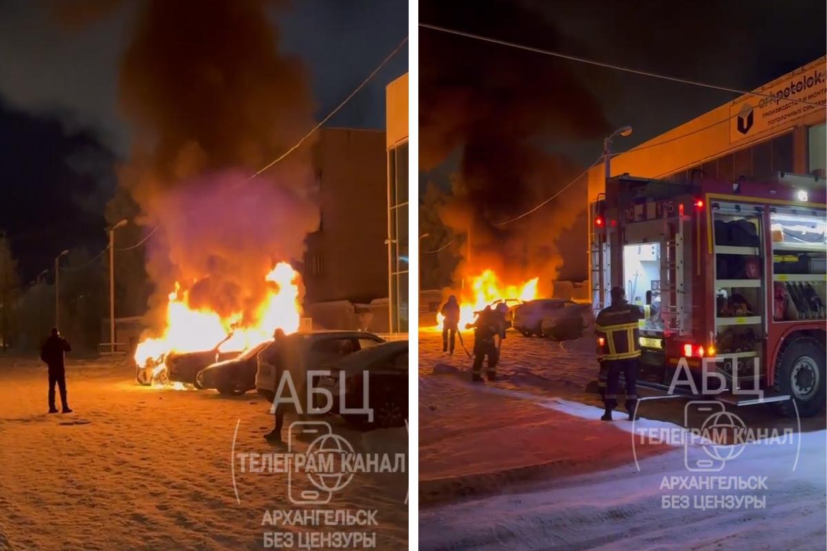 В ночное время в Архангельске огонь уничтожил два легковых автомобиля и повредил третий. Инцидент был зафиксирован на видео, записи с горящими машинами быстро распространились в Telegram-каналах.