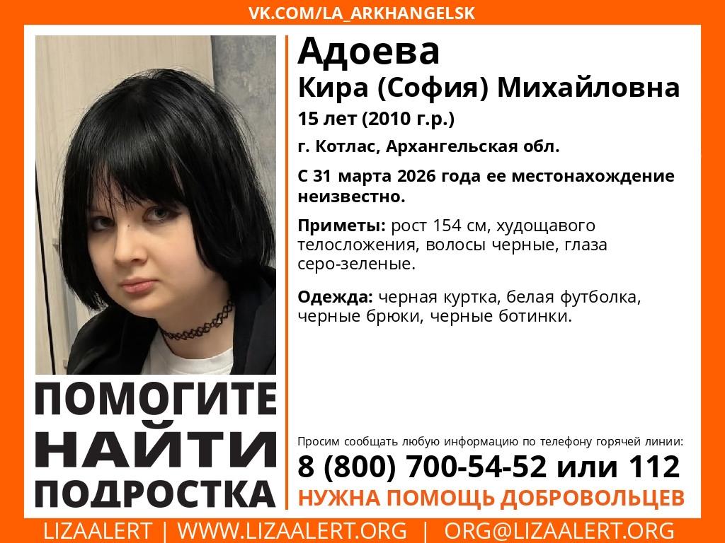 Поиски 15-летней подростки, пропавшей в Котласе, ведутся с 1 апреля. Девушка не выходит на связь с 31 марта.