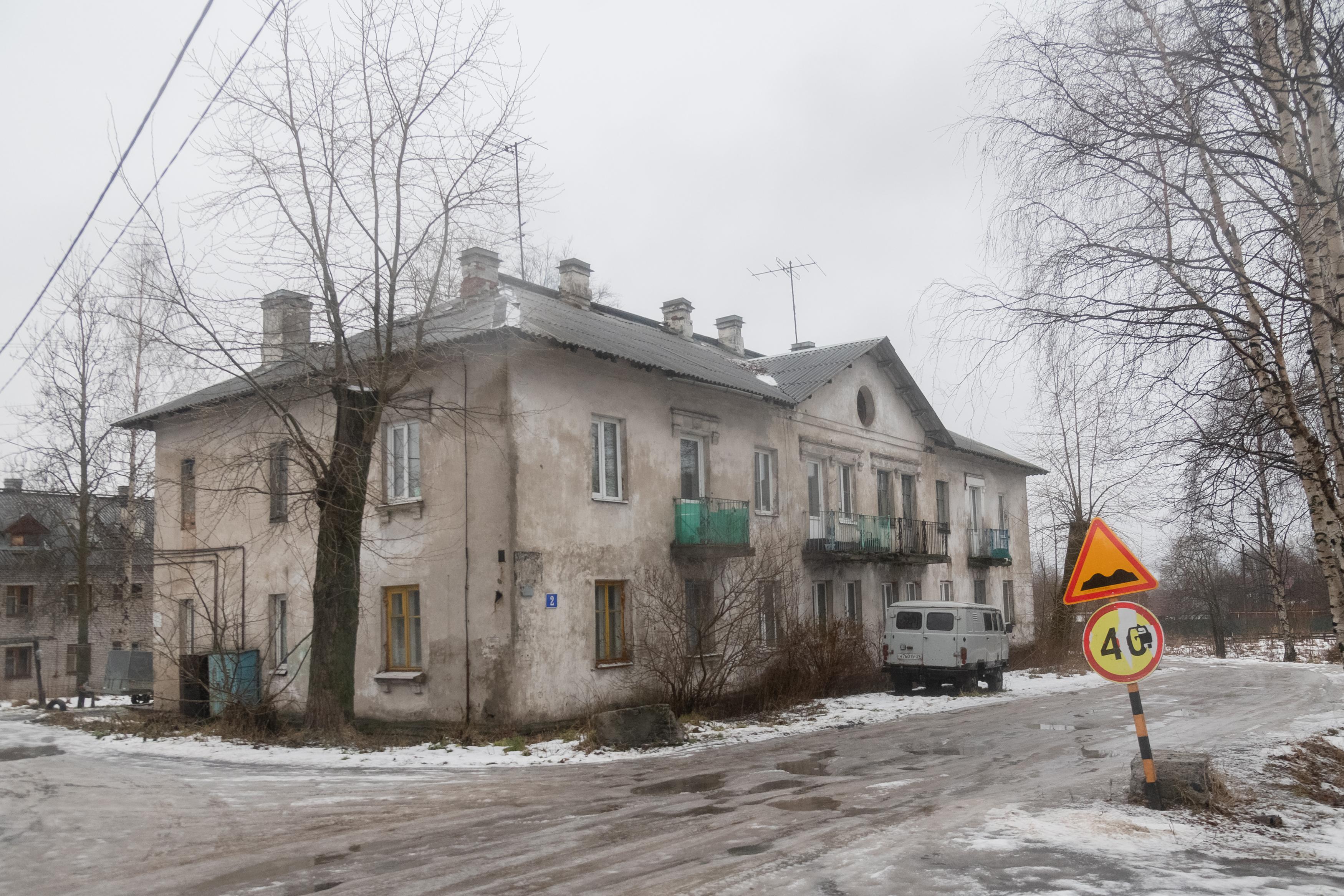 В Исакогорском округе Архангельска несколько кирпичных и шлакоблочных зданий признаны ветхими. В их числе — дом №2 на улице Тяговой. Крупные трещины видны на фундаменте, но люди всё ещё живут в этом доме, что заметно по окнам и балконам.