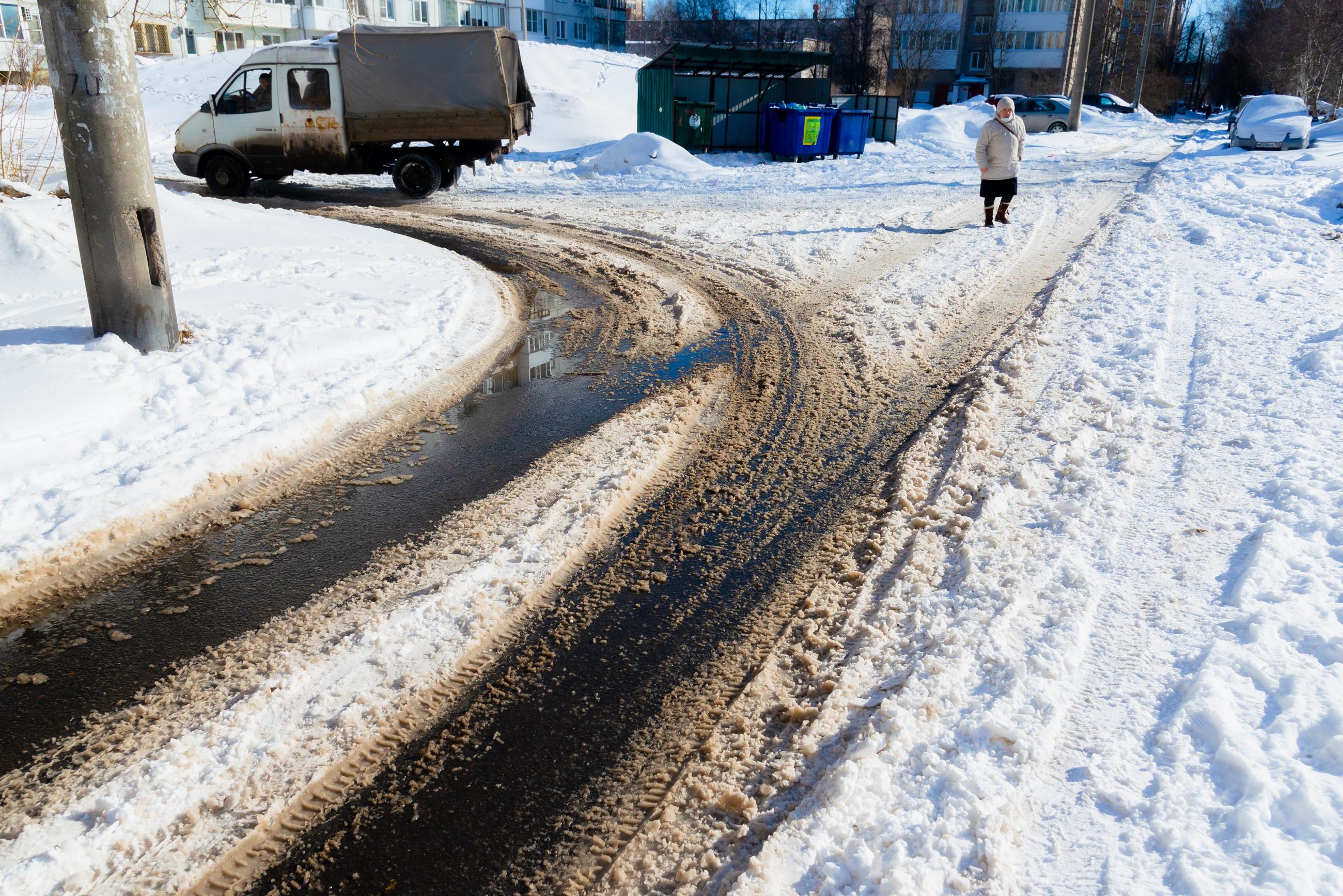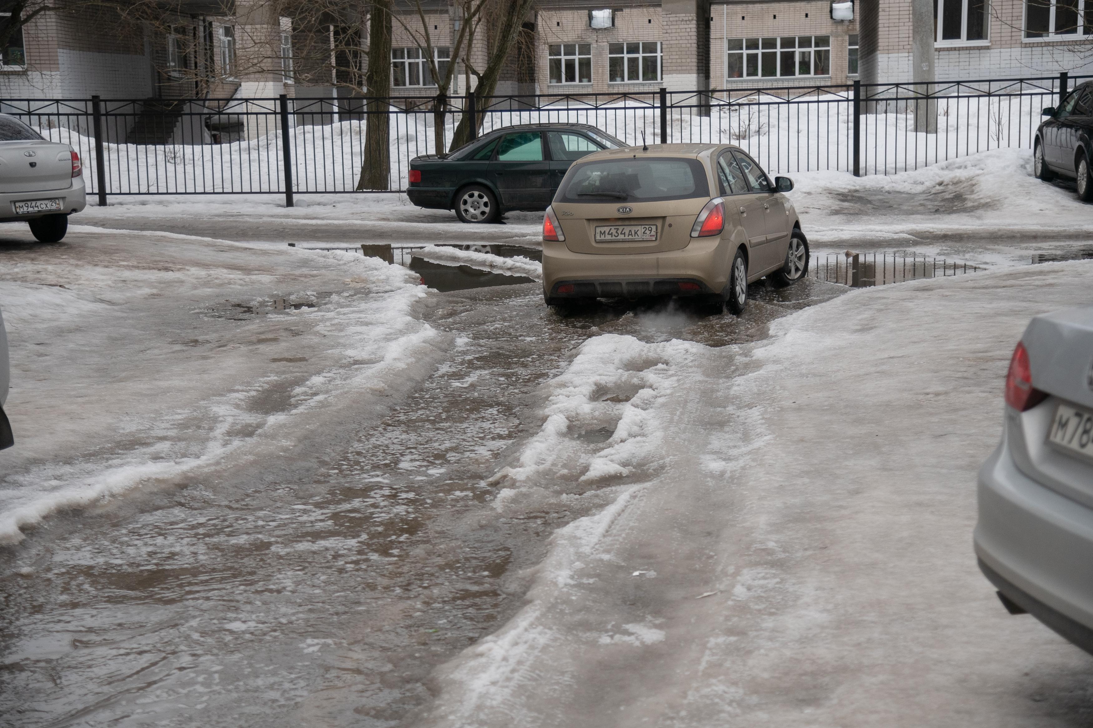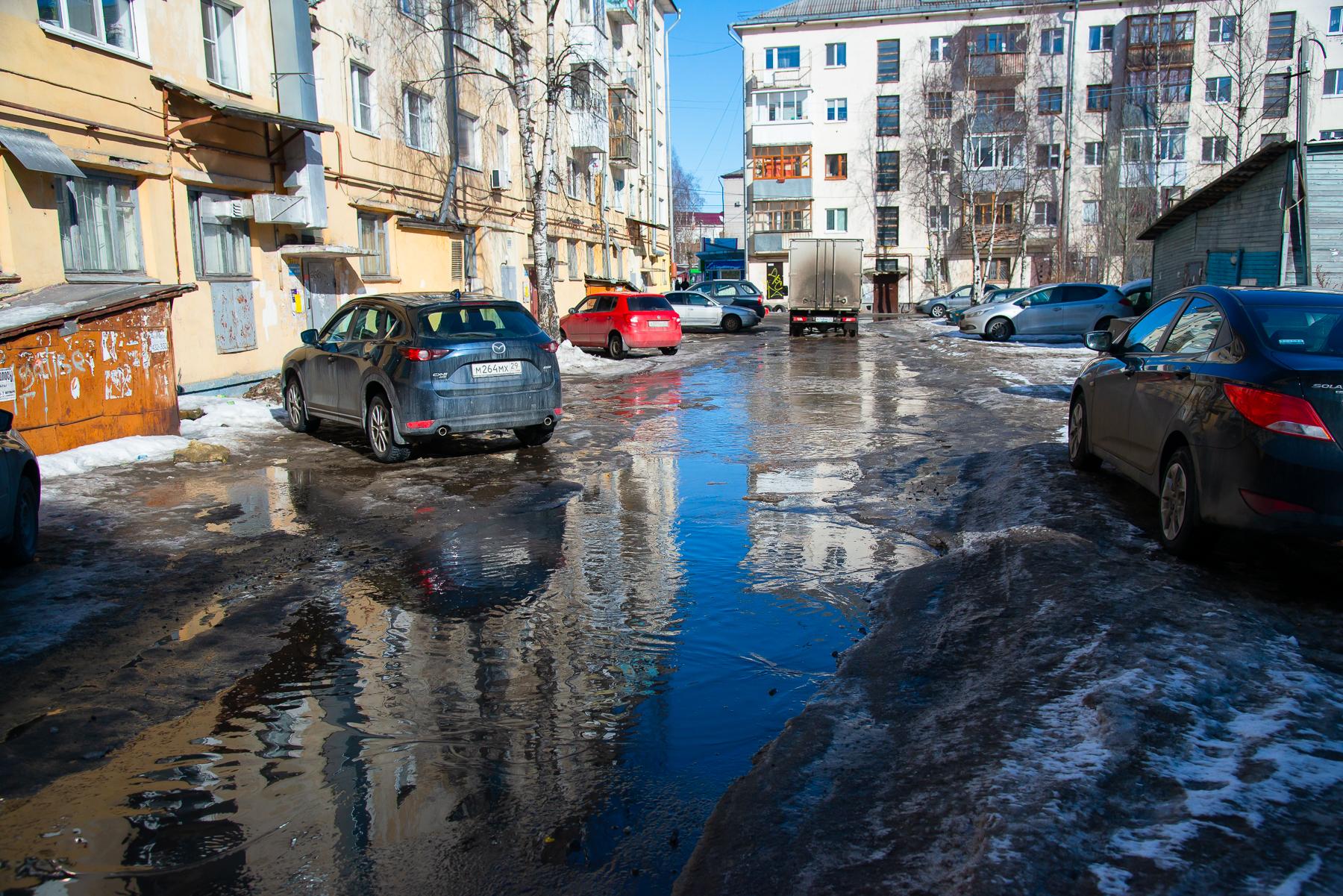 Снега в 2022 году также было много: архангелогородцы всё ещё катались на лыжах по набережной. При этом во многих дворах уже стояла вода, подтапливая проезды.
