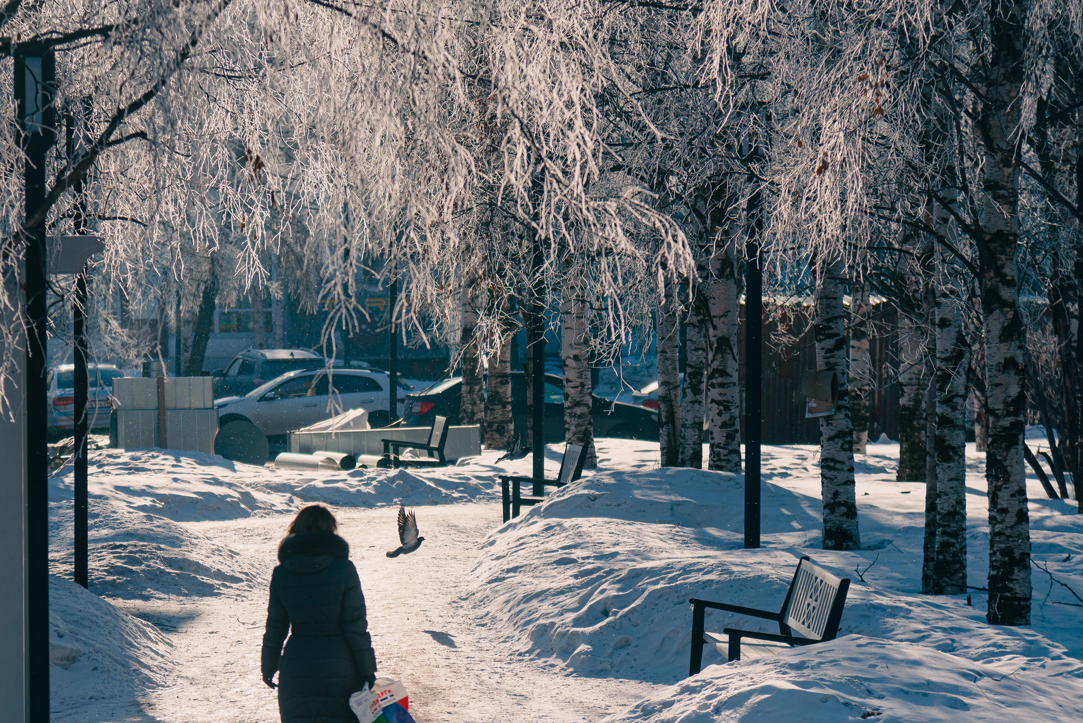 В 2024 году наблюдались частые перепады температур: снег неоднократно таял, но затем снова подмерзал. На снимках того периода заметен иней и снег на ветвях деревьев.