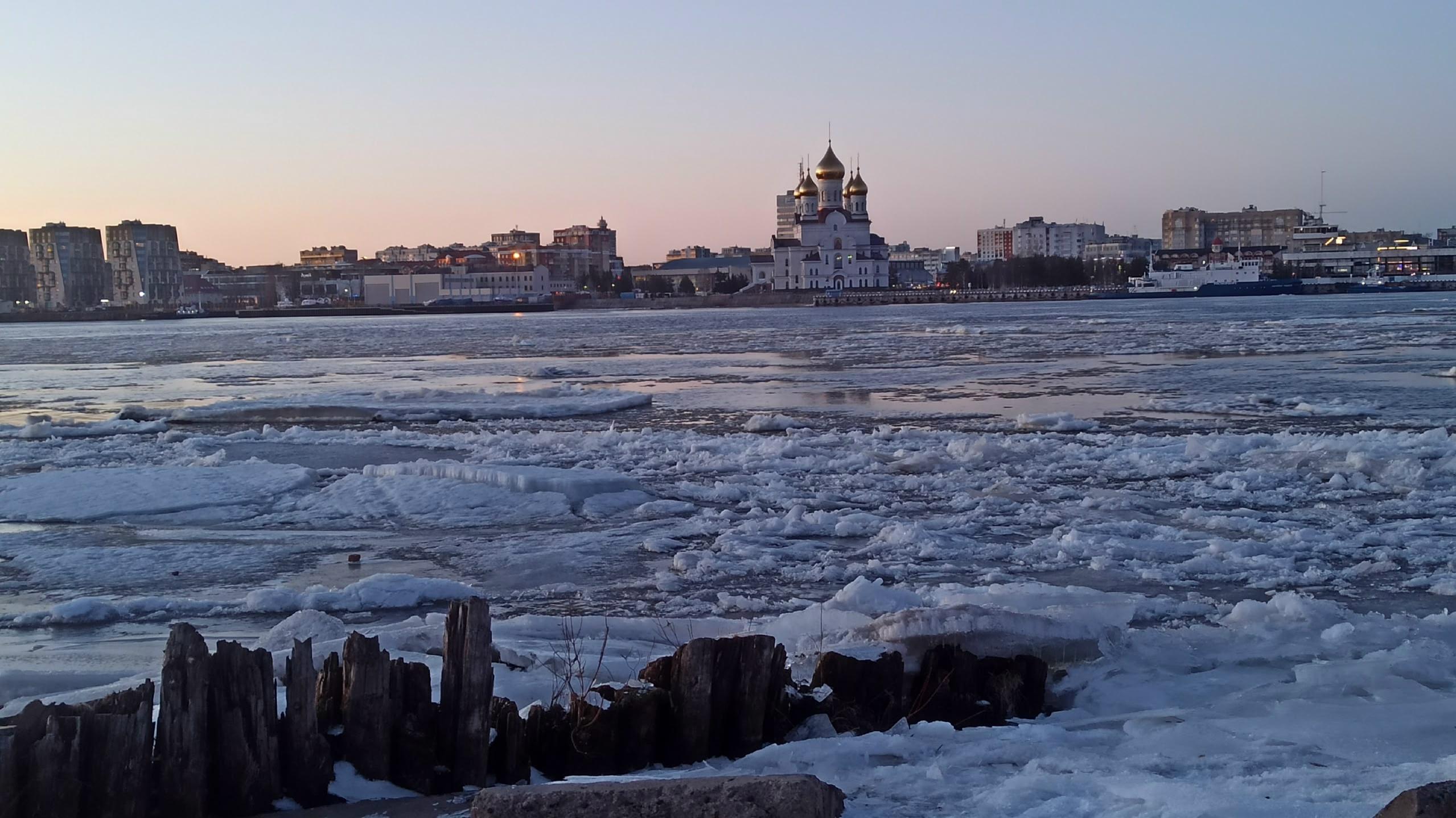 Северная Двина в центре города пока чиста, но лед уже движется узкой полосой вдоль левого берега.