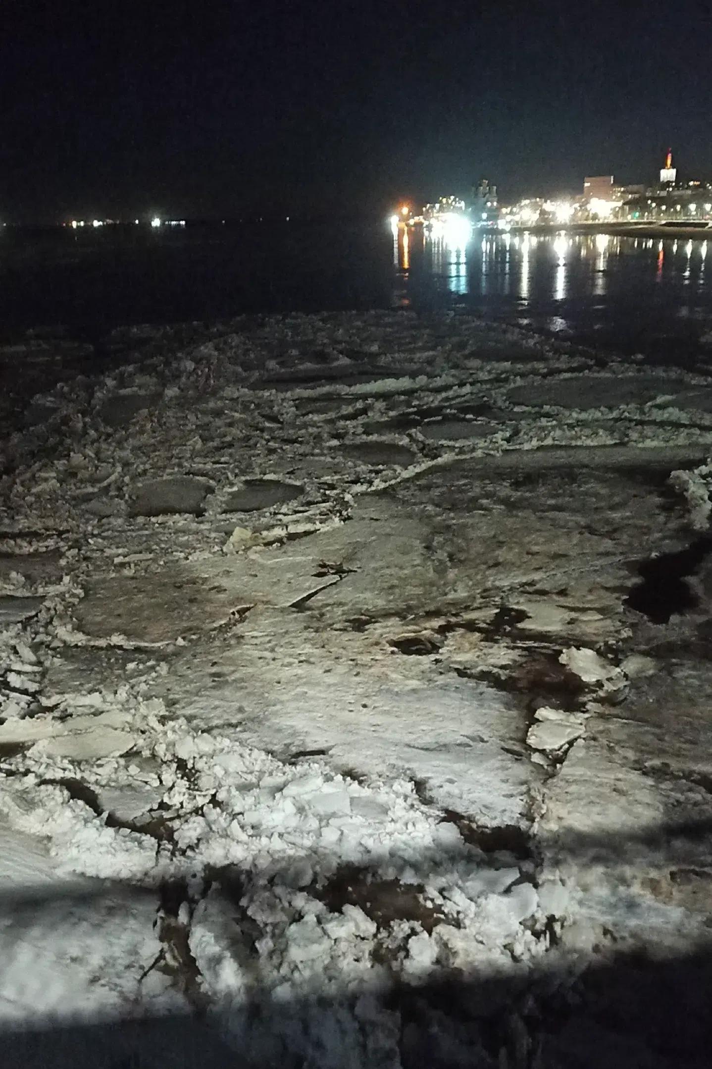 Еще одно видео поступило от наблюдателя с причала 155 Морского-речного вокзала (МРВ). Ранее, в 19:45, в районе МРВ лед двигался узкой полосой вдоль левого берега, его уносило в Никольский рукав дельты Северной Двины.