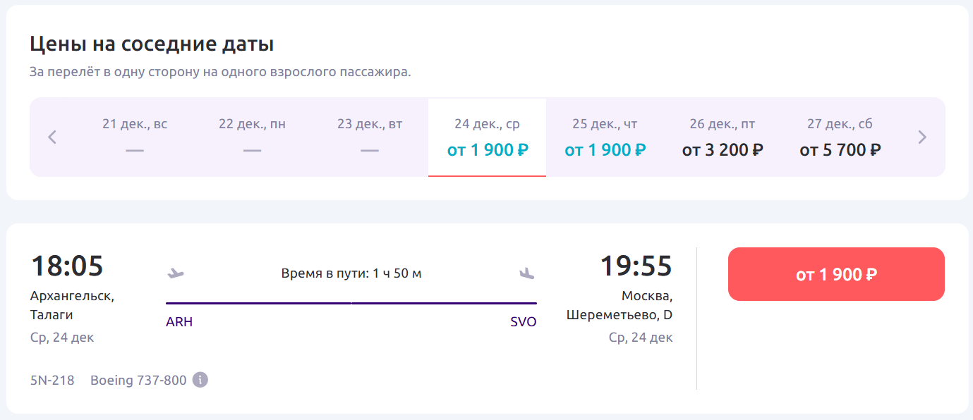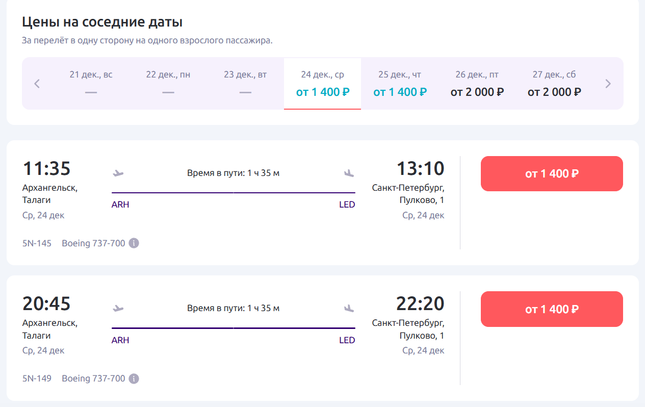 Согласно данным на сайте авиакомпании «Смартавиа», билет на рейс 24 декабря можно приобрести от 1400 рублей.