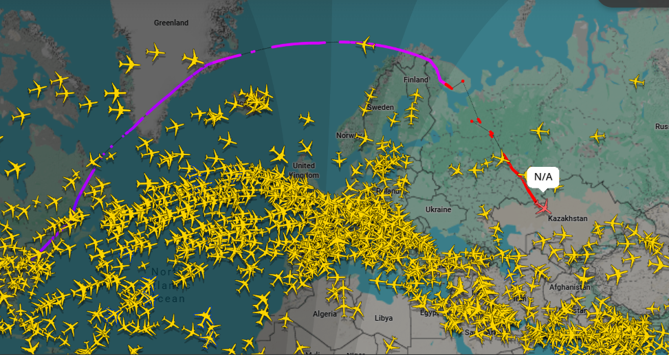 Согласно данным онлайн-сервиса Flightradar, американский Boeing 787, вылетевший с авиабазы Эндрюс под Вашингтоном, вновь появился на отслеживании после того, как пересек территорию России и вошел в воздушное пространство Казахстана.