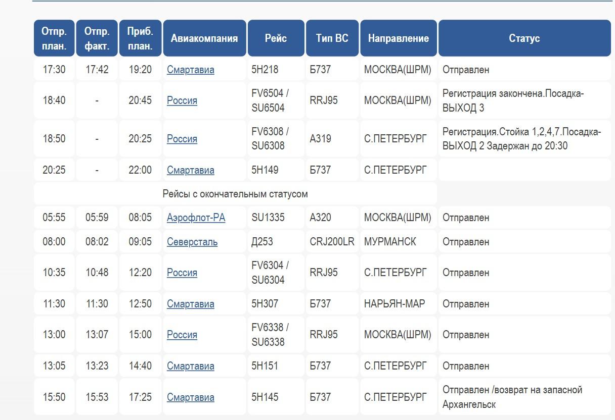 Табло вылетов в аэропорту Архангельска