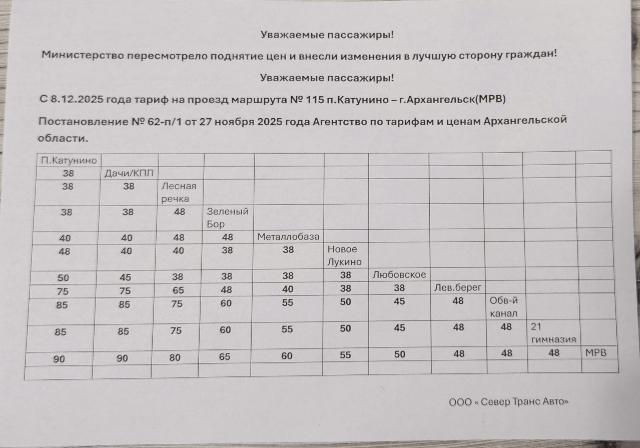 В социальных сетях появились жалобы жителей посёлка Катунино на значительное увеличение цен за проезд в автобусах, следующих до Архангельска. Речь идёт о маршрутах №115, который обслуживает ООО «Север Транс Авто», и №125, оператором которого является ТРК «Рико».