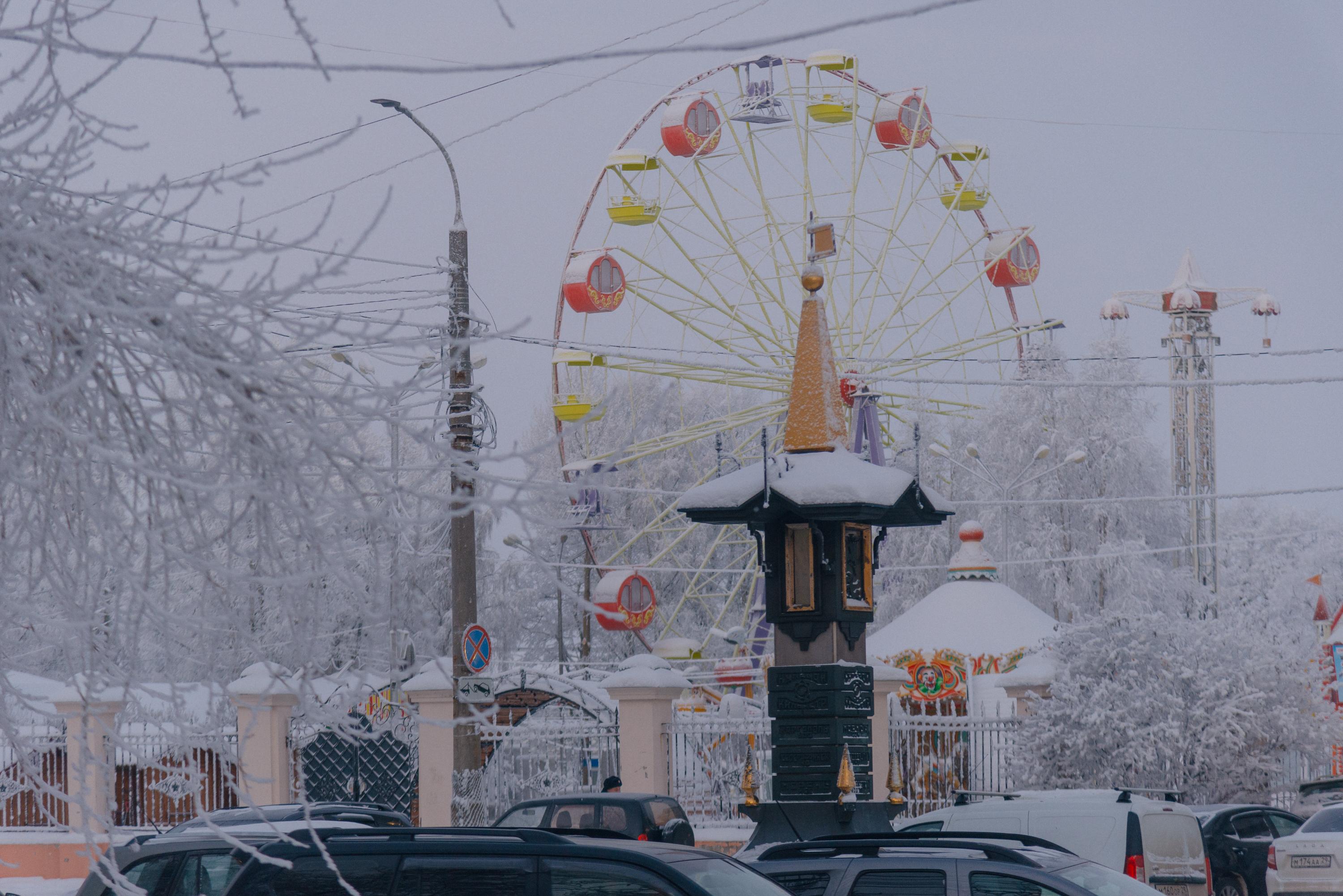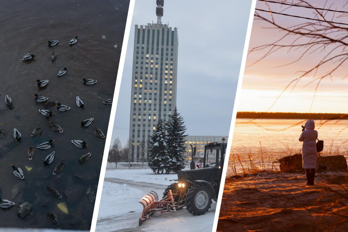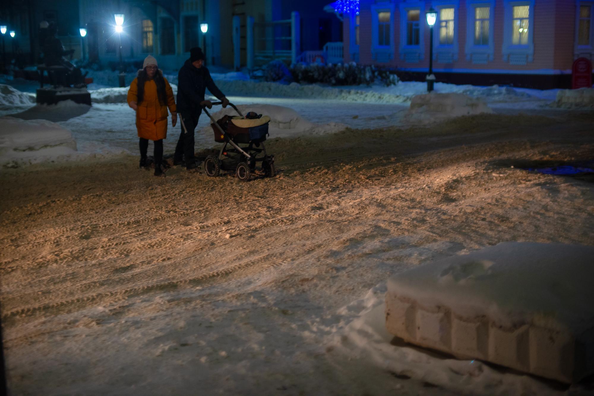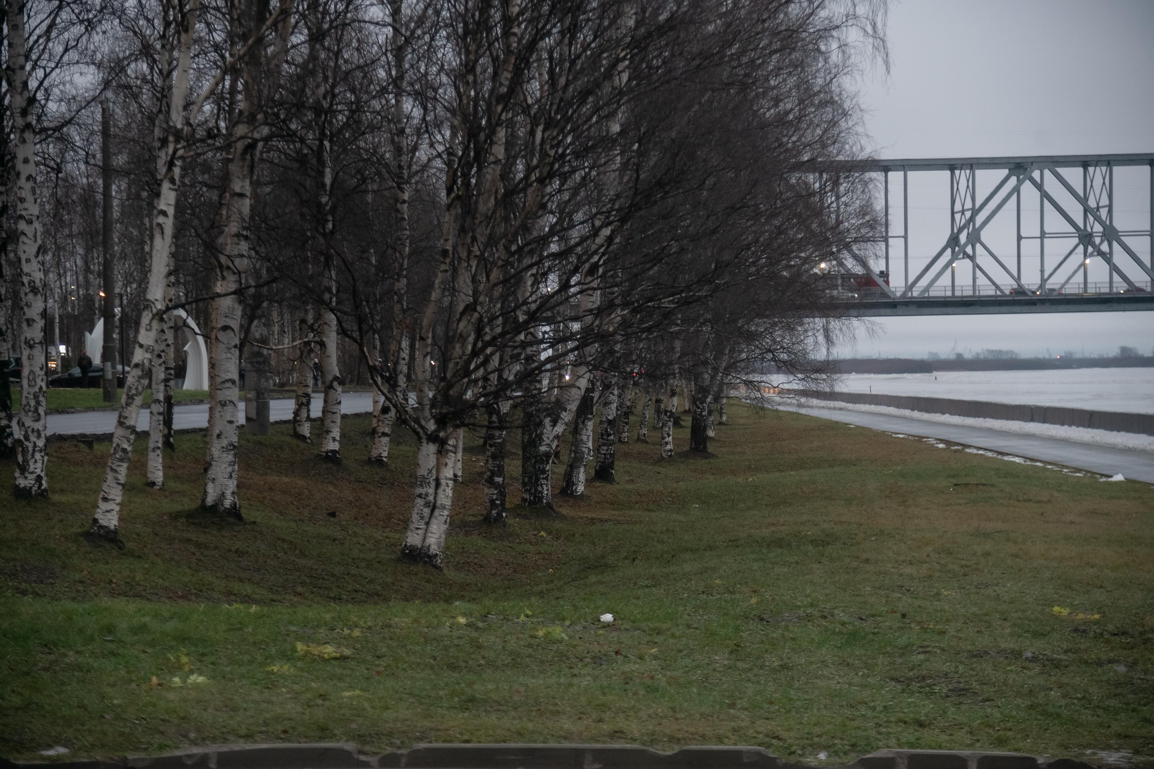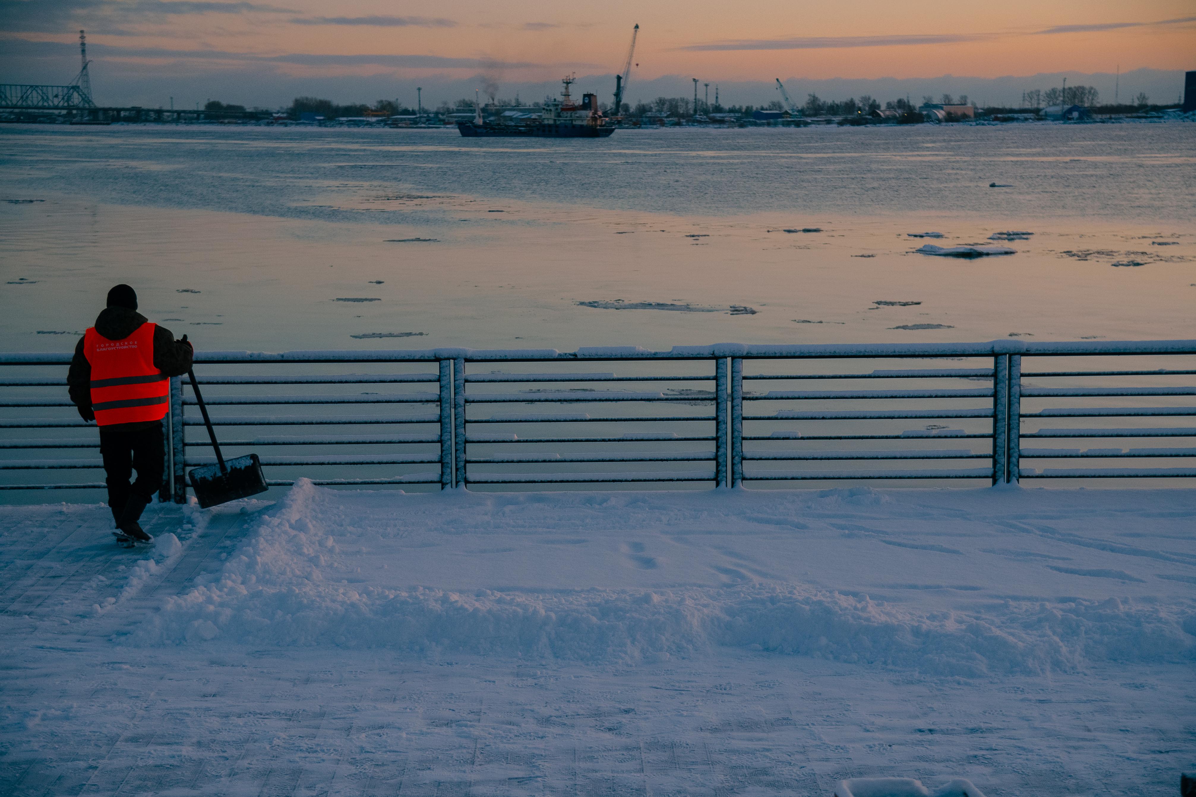 На улицах уже лежали сугробы, дети катались с горок, а коммунальные службы использовали снегоуборщики. При этом пешеходных переправ через Северную Двину также не было.